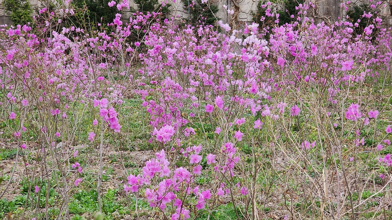 길 양쪽으로는 야트막한 산이 있고 골짜기에서 내려온 물이 시냇물이 되어 산허리를 돌아올 때는 돌담을 헤치느라 흰 물보라가 넘쳐나기도 했다. 소나무 가지 사이를 부지런히 들락거리며 따뜻한 바람이 불어올 때쯤이면 진달래가 피었다. 그 사이사이에 길게 뻗은 하얀 싸리 꽃이 분홍색 진달래 속에서 더 하얗게 빛났다. 하얀 솜털 속에 감추어진 진자줏빛 할미꽃도 활짝 피어있지만 고개 숙이고 있는 자태가 슬픔이 더해지는 것은 전래동화에 내려온 이야기 때문이리라.