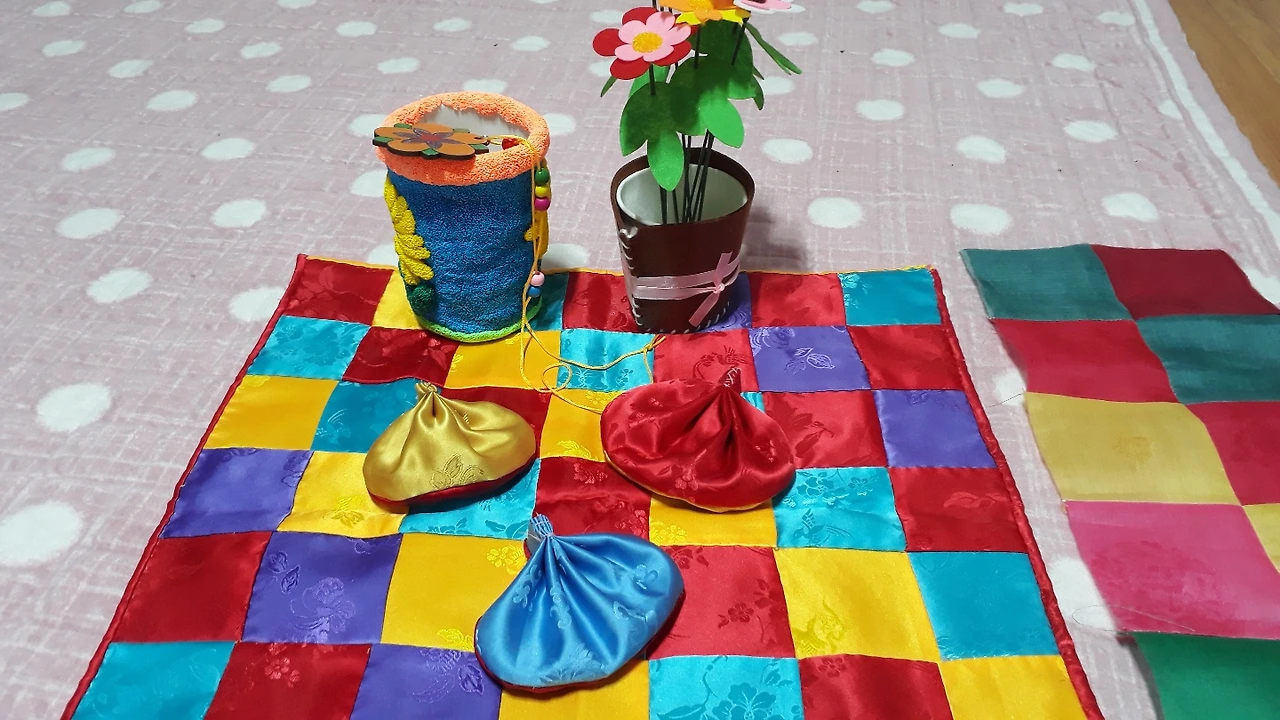 주간보호센터 다녀와서도 잠시 쉬었다가 천을 접고 자르고 색깔 맞추고 한 땀 한 땀 손으로 꿰매시더니 예쁜 상보를 만들어 놓으셨다.
