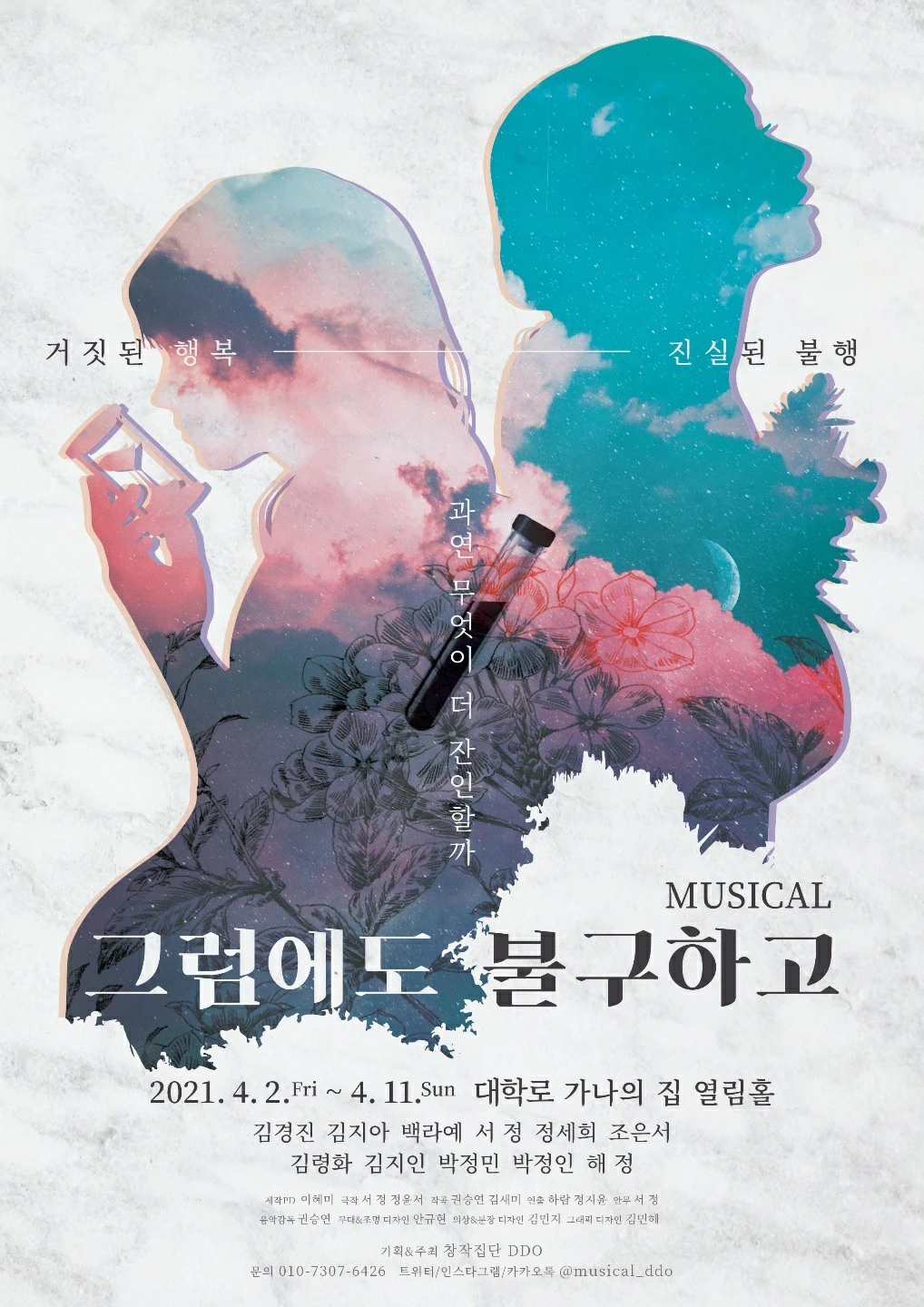 뮤지컬 《그럼에도 불구하고》는 제2차 세계대전이 끝난 직후의 이야기다. 사랑하는 사람을 잃거나 전쟁 트라우마에 시달리는 사람들을 위해서 과학자들이 기억 속의 행복한 날을 찾아주는 연구를 시작하고, 드디어 신약 ‘드리머’를 발명하게 된다. 하지만 이 약은 장기 복용하면 현실을 잊고 꿈속을 헤매다 종국에는 아주 깨어날 수 없게 되는 부작용이 있다. 전쟁으로 인해 언니를 잃은 연구소장 시에나는 약의 부작용을 잘 알고 있었다. 그럼에도 그녀는 그 사실을 감추고 몰래 자신도 약을 먹으며 계속 언니와 함께하는 꿈을 꾸다 결국 꿈속의 언니를 찾아가는 길을 택하고야 만다. 하지만 마찬가지로 사랑하는 사람을 잃고 약을 복용하던 로즈윌로는 자신을 아끼는 친구의 도움으로 현실로 돌아온다. 고통을 받아들여야 하는 것이 삶이지만 그럼에도 불구하고 살아갈 이유는 하나가 아니라는 깨달음을 얻은 채.