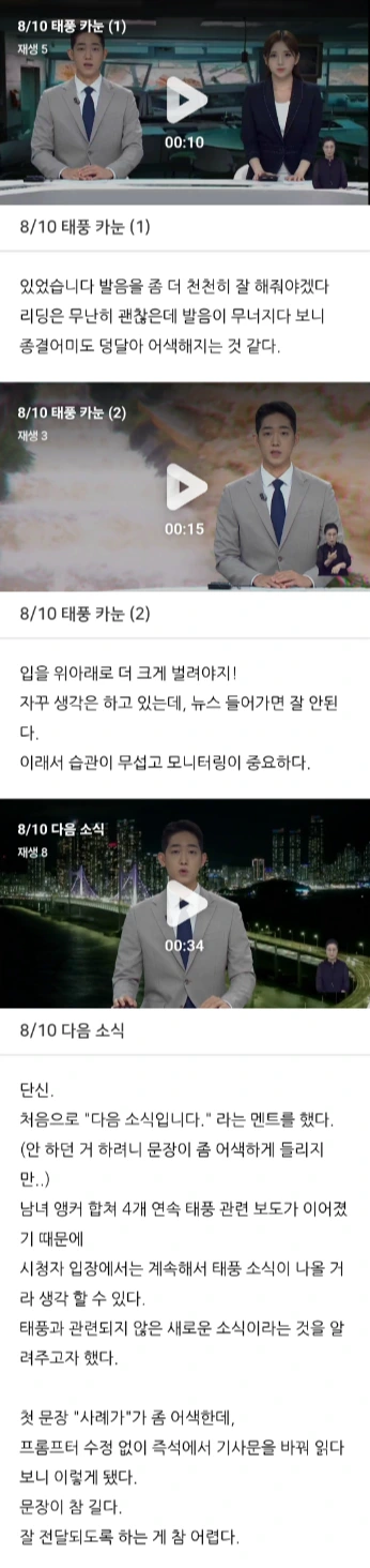 KBS 공채 아나운서라는 꿈을 이루고 지난 날의 모습들을 찾아봤습니다. 이전 직장들에서 뉴스했던 모습들, 아나운서 학원에서 연습하던 기록들, 대학교 방송국에서 망가져가며 남긴 영상들까지 찾아봤습니다. 어떻게 이런 모습으로 방송을 했나 싶다가도 참 대견한 마음이 들었습니다. 부족하다는 것은 그때도 알았을 텐데 참 꾸준히 노력했다는 게 보였습니다.