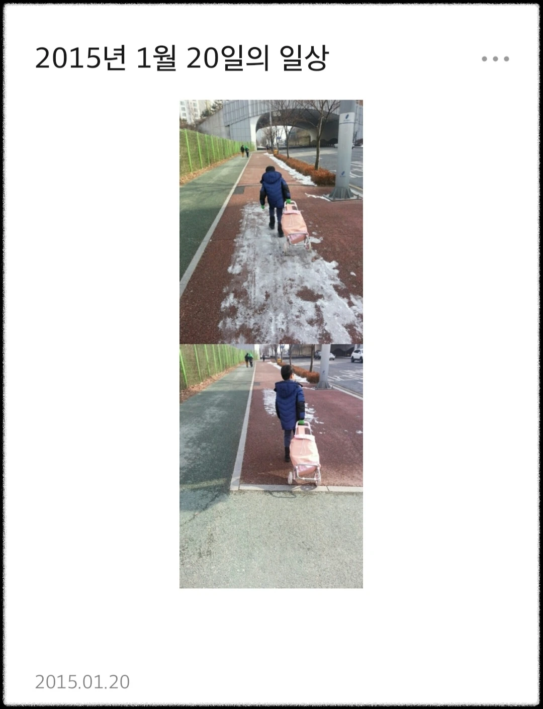 오늘 싸이월드 앱을 켜서 사진을 보다가 엄마를 대신해 씩씩하게 장바구니를 끌고 가는 네 뒷모습이 찍힌 사진을 찾았어. 어찌나 예쁘던지. 어릴 때는 고사리손으로 엄마를 도와주는 뒷모습을 보며 고맙고 행복해했는데, 이제는 매일 학원으로 향하는 뒷모습을 보며 안타까워하고 있구나. 한참 동안 네 어릴 적 사진을 들여다봤어. 도토리처럼 똘망똘망한 예쁜 아이였는데...