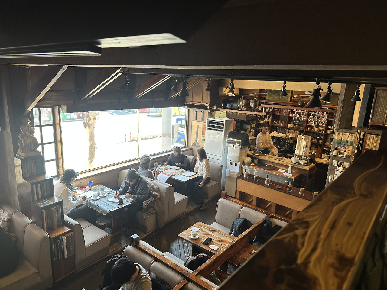천장이 낮은 이층에 자리 잡은 나는 아래를 내려다보는 와이드뷰로 다방 전체의 모습을 담으려고
