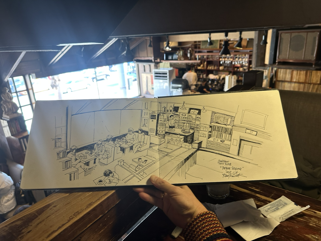 역시 유명한 장소였기 때문에 오랜 시간을 앉아 있을 수 없어서 스케치만 완성하고 채색은 모임 장소인 '마로니에공원'에 있는 예술가의 집 카페로 옮겨본다.