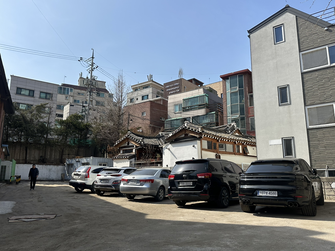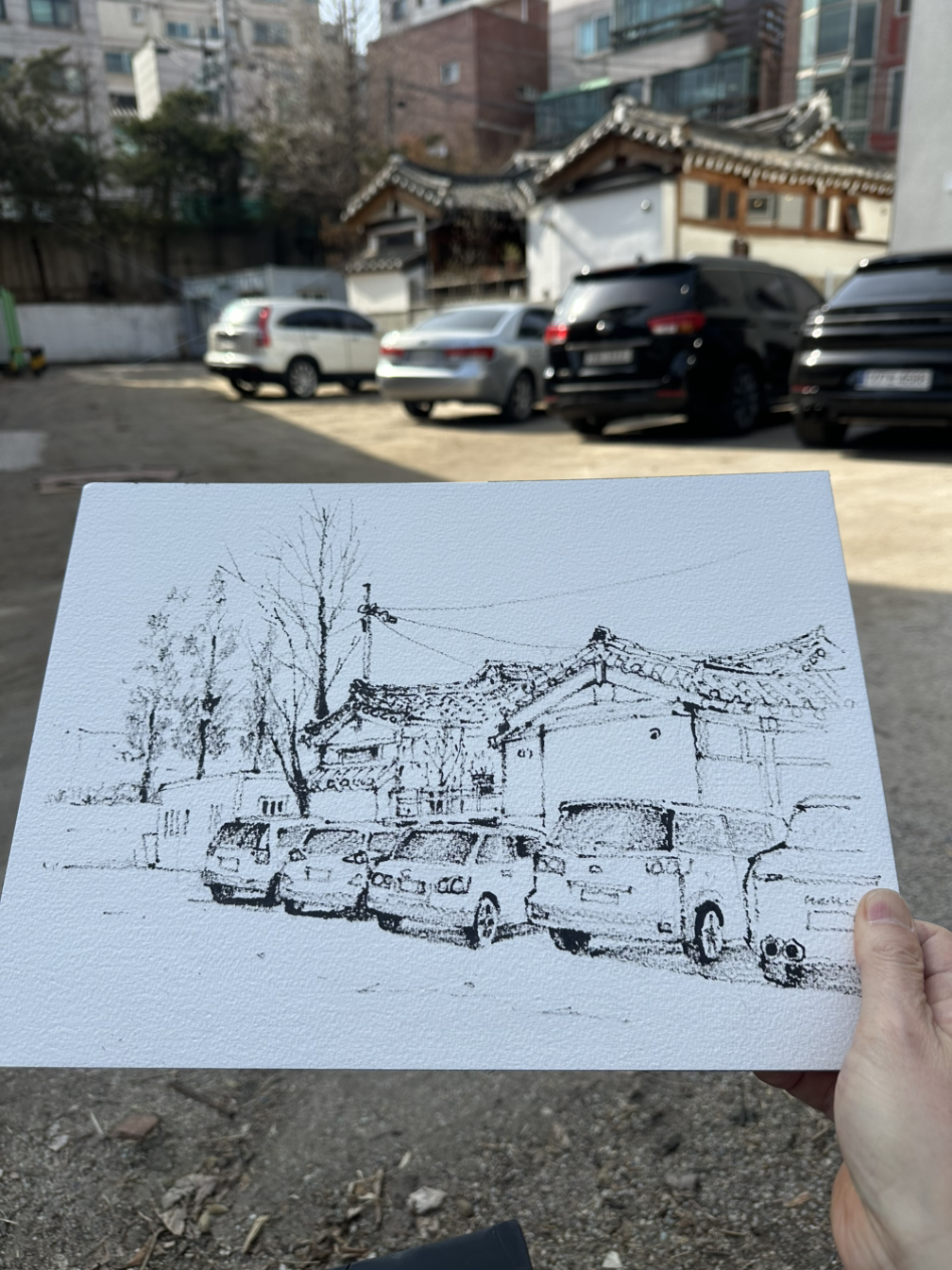 바깥쪽 석교교회 마당에서 카페 서시그를 바라보며 자리 잡고 이번에 먹물로 드로잉을 시작한다.