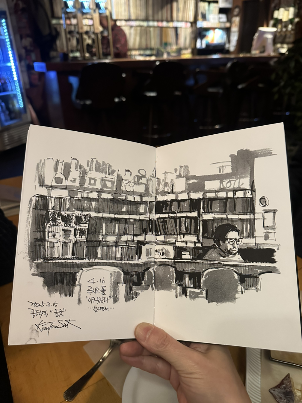 혼자 열심히 드로잉 하는 분이 계셨는데 요즘 내가 좋아하는 드로잉작가"yilin샘"이 계신걸 한참 후 알게 되었다. 참신하고 독창적인 드로잉작품으로 잘 나가는 작가와 반가운 인사를 나누며 각자 서로 다른 스타일의 그림을 완성해 본다.