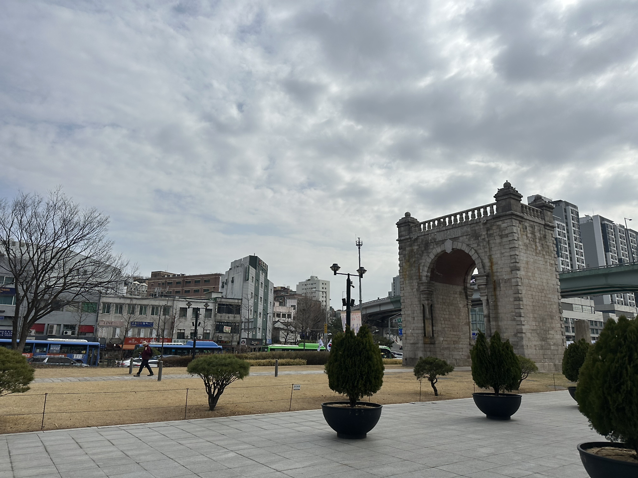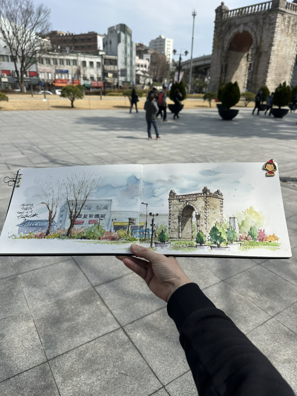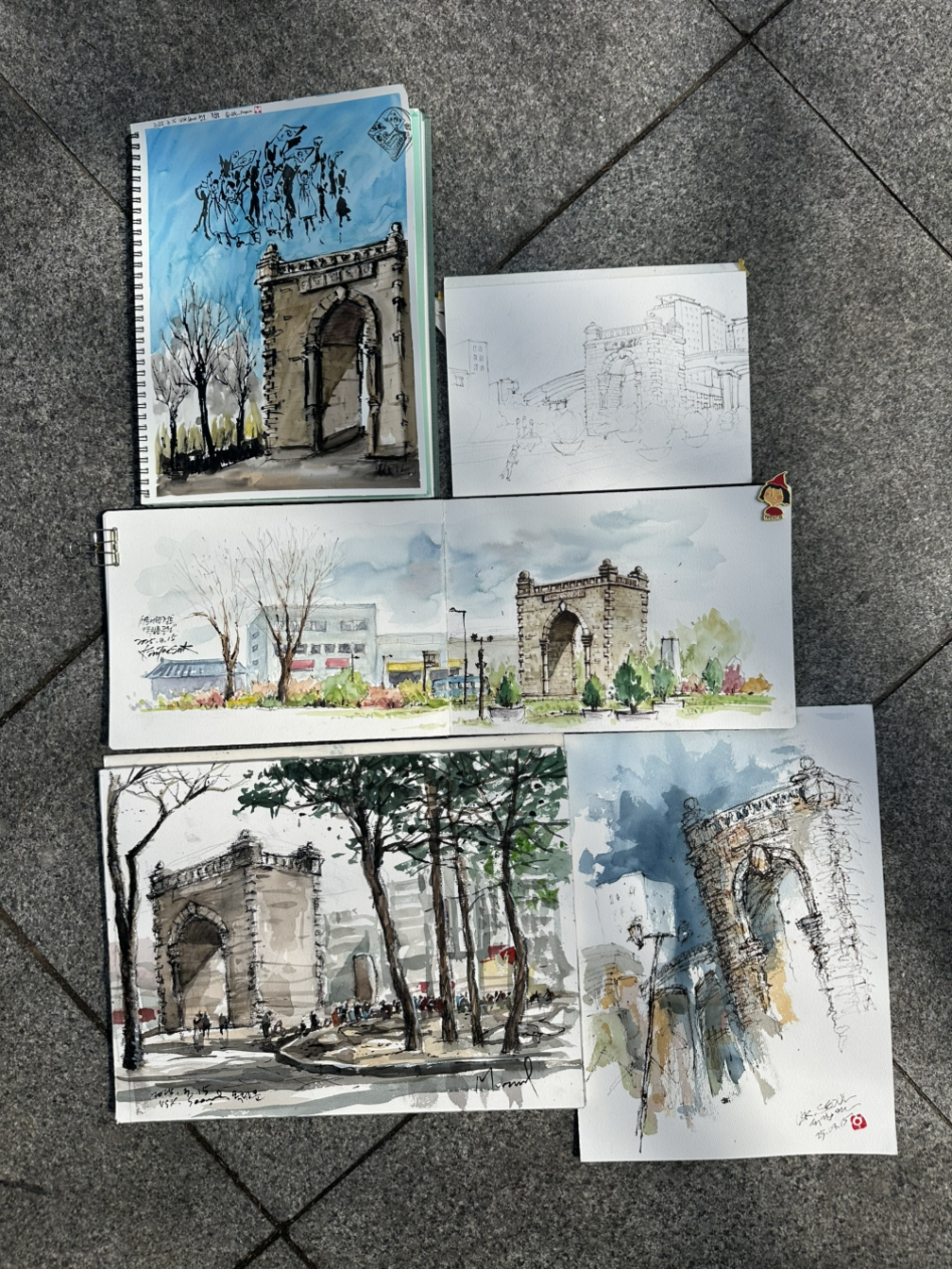독립문 앞에 므즐형님, 실베형님, 문샘과 자리를 잡고 현장드로잉을 시작한다.