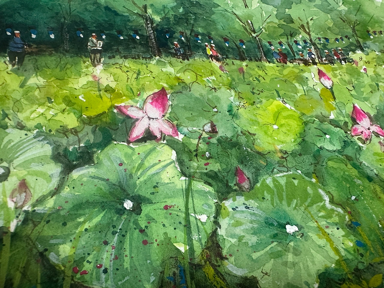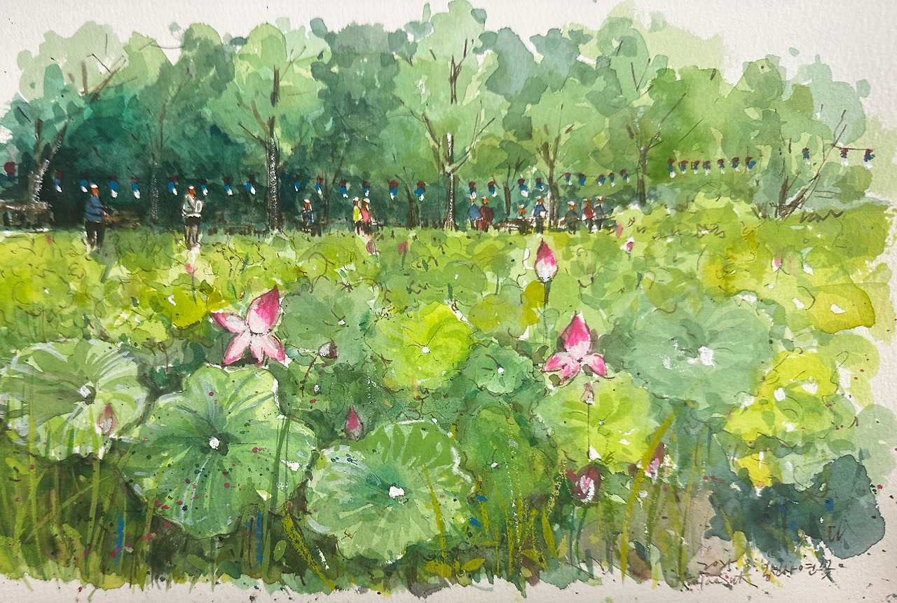 화창한 날씨와 가족, 연인들끼리 행복한 휴일을 보내는 광경을 담아내기 위해 연꽃을 좀 더 확대해 강조하면서 원근감을 주고 빛의 밝은 느낌을 주었다.