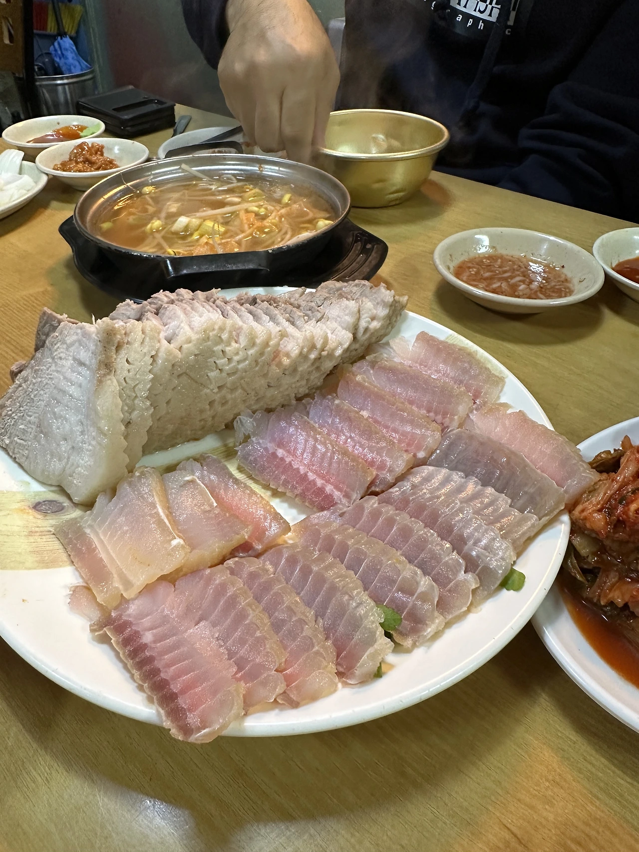 홍어삼합은 푹삭힌 홍어에 알맞게 삶아진 돼지수육, 푹익은 신 김치를 곁들여 먹는 맛이 일품인데