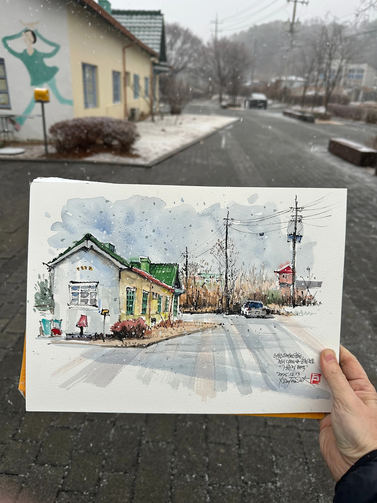 김유정 폐역 열차 안에 자리를 잡고 창밖으로 보이는 설경 속 김유정 폐역을 그렸다.