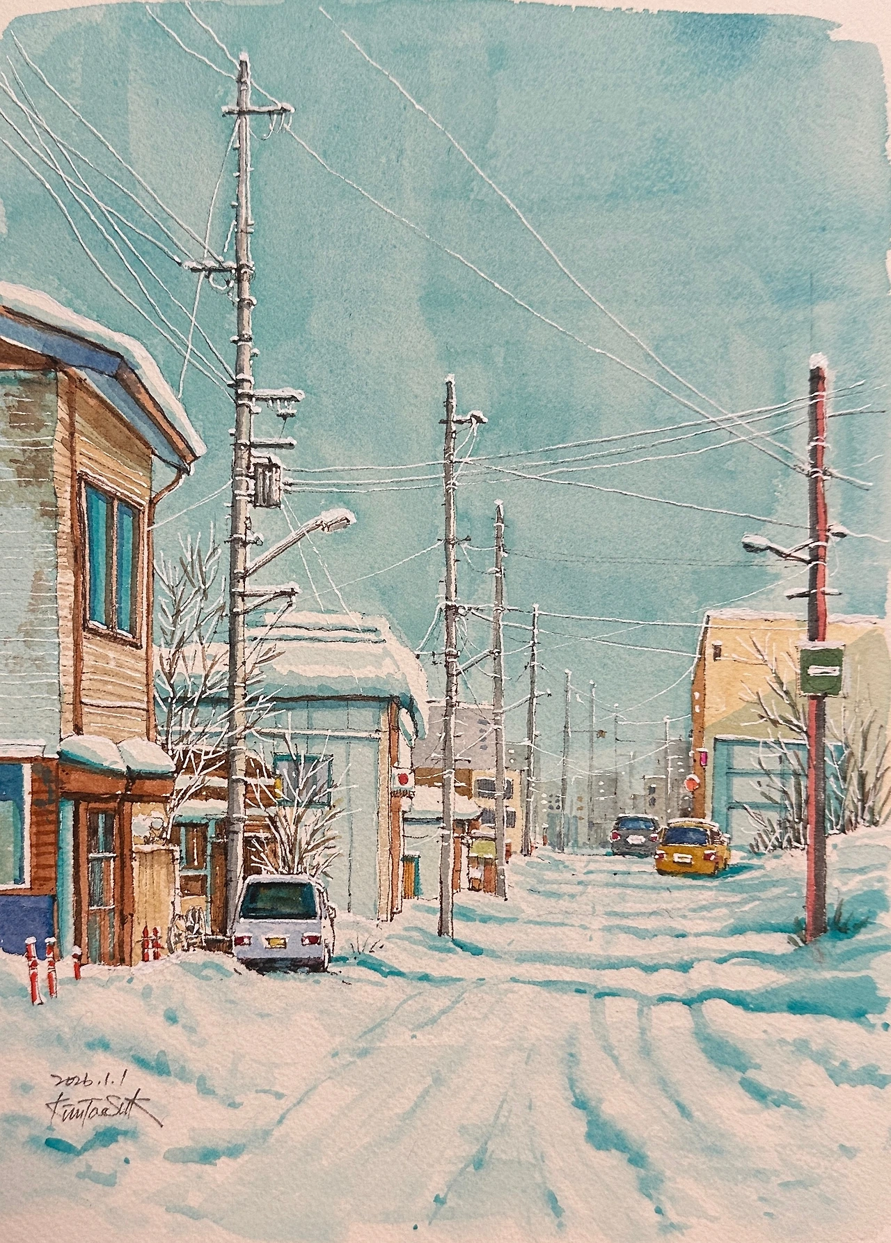늘 메인 컬러로 쓰지 않던 “터콰이즈 블루”를 눈그림자와 하늘에 머물게 하자