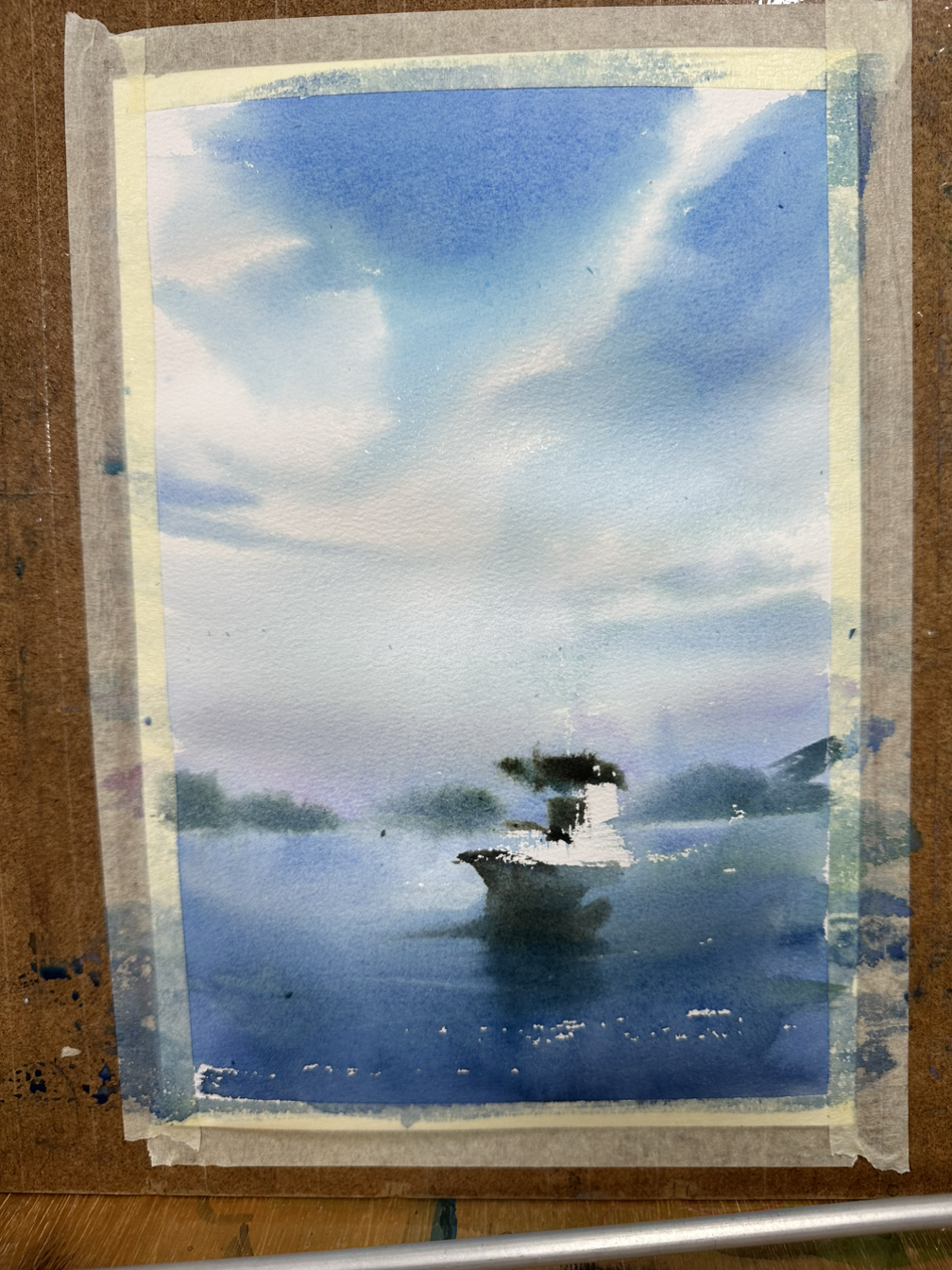 하늘을 강렬하게 표현하고 싶어 바탕에 물칠을 하고 어둡게 채색을 시작하는데