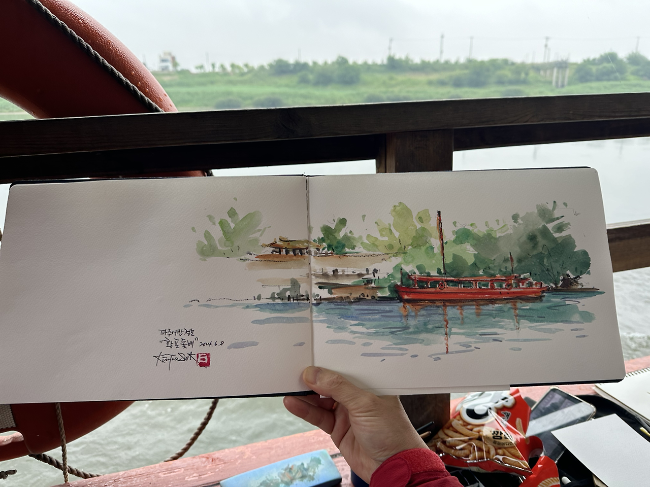 황포돛배에서 한시가량의 짧은 시간 동안 그림 하나 완성해야 하니 눈과 손은 정신없이 바쁘다.