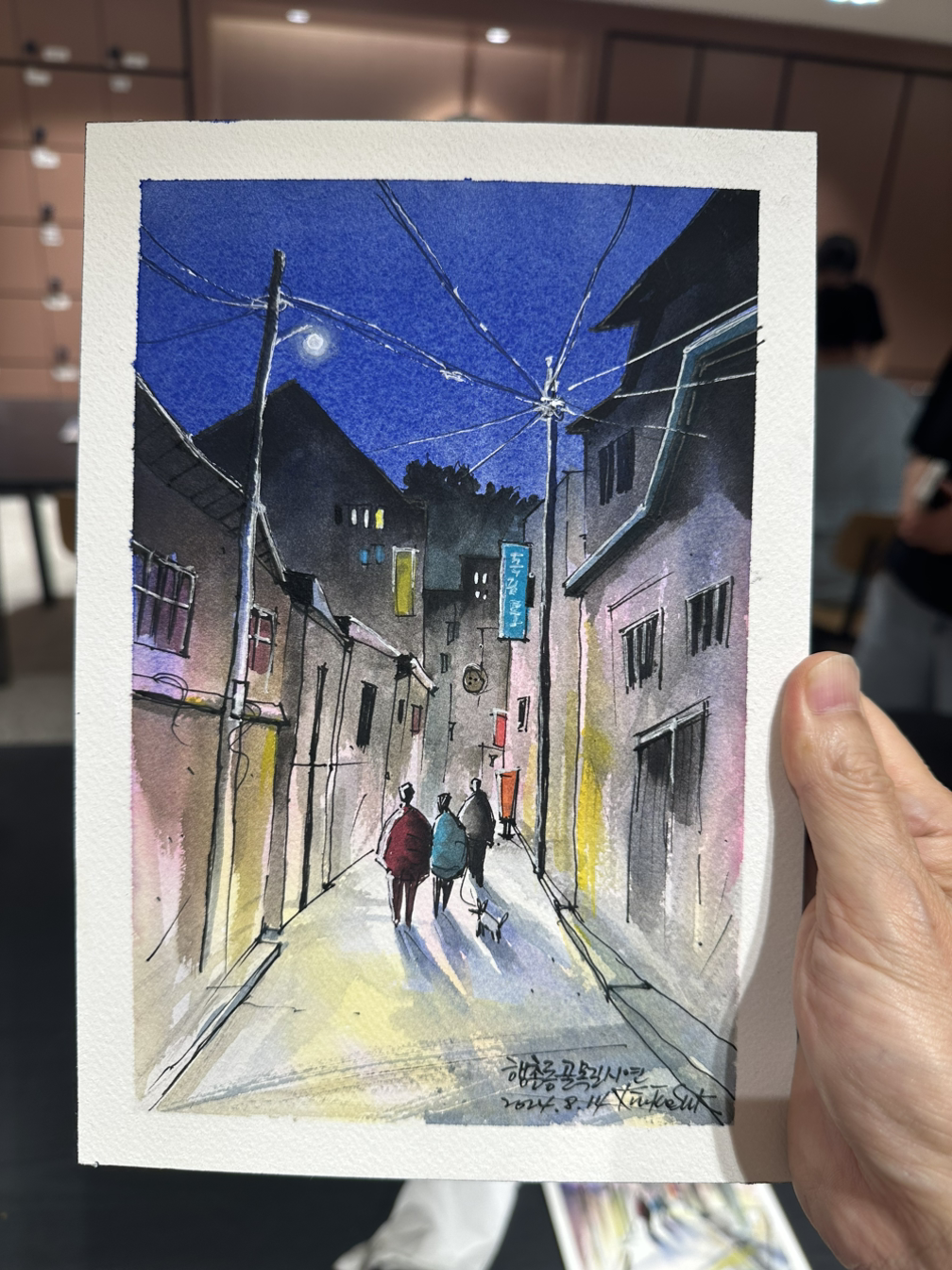 그리고 사람과 사물에 그림자를 길게 표현하여 골목 야경을 되도록 정겹게 그려 낸다.