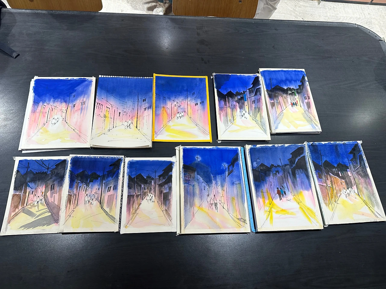 채색은 하늘에서 땅으로 어둠이 내려오는 느낌으로 표현해야 하기 때문에 전체적으로 물을 바른 후