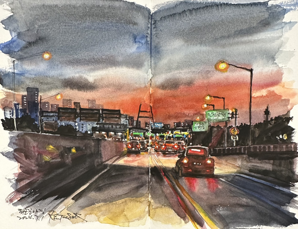 야경 그림의 가장 중요한 점은 하늘에서 내려오는 어둠의 불빛이 땅까지 내려오게 그리고 그 속에서 가로등이나 차량 불빛들이 어둠을 깨우듯 일 부분만 환하게 표현하는 것이 중요하다.