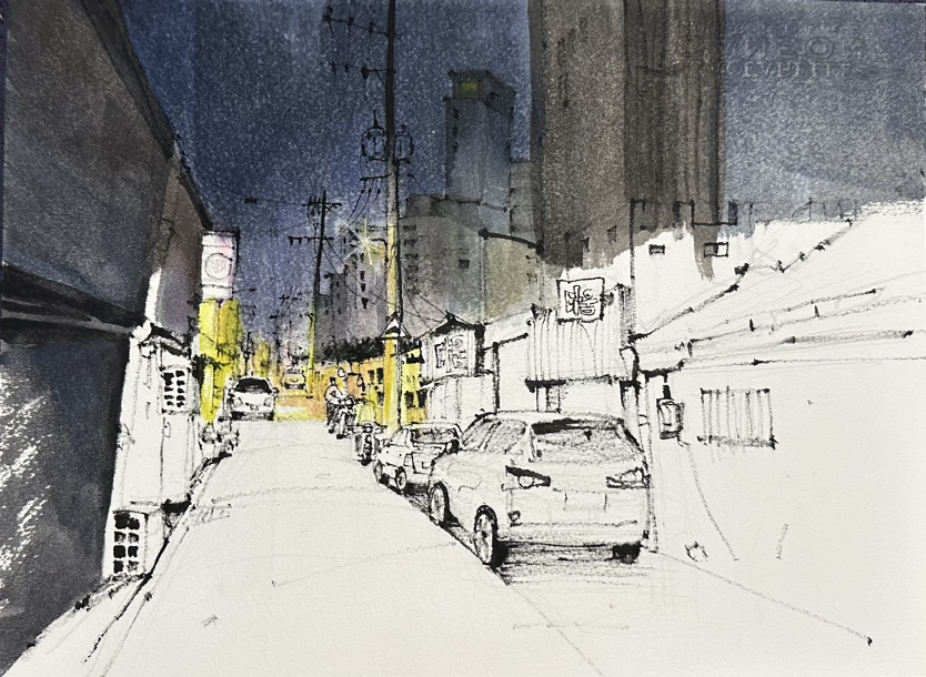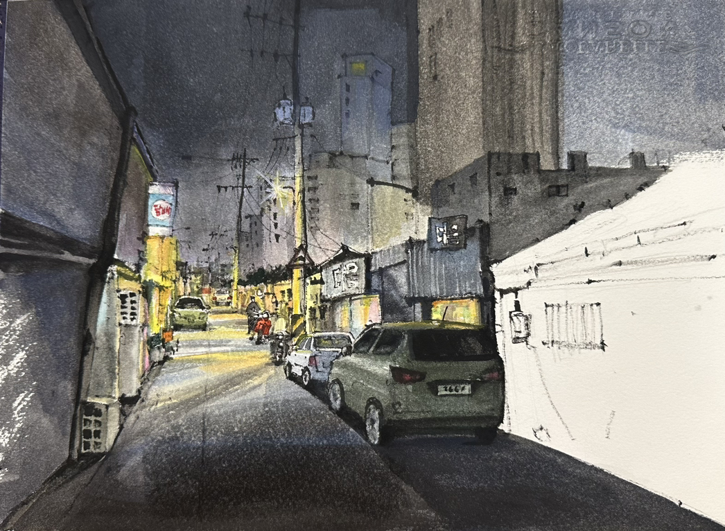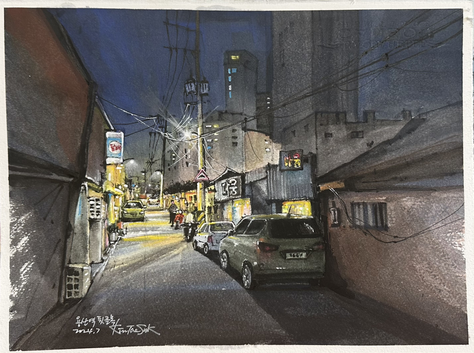 이 그림은 지난 고등학교 동창 모임 때 찍어놓은 용산에 위치한 뒷골목의 어느 식당 야경 사진을 보고 그린그림이다.