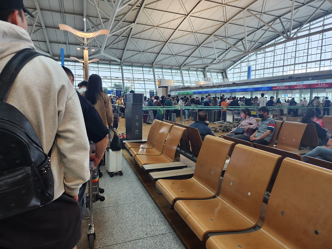 사람이 엄청나게 많았다. 대기선 밖에서까지 기다리는 정도였다. 체크인은 모바일로 했지만 따로 짐만 붙이는 곳이 없어 보여(물어보니 진짜 없었다! 모바일체크인은 좌석 예약용인 걸까) 줄을 서야 했다. 오늘은 정말 여러 가지로 일찍 나서길 잘한 날이다. 만약 내가 오늘 파도처럼 흘러가는 대로 살았으면 오늘 바위에 맞아 멘탈이 부서졌을 것이니 말이다. 여유롭게 나와서 마음만 파도처럼 흐르는 게 이득인 거 같다.