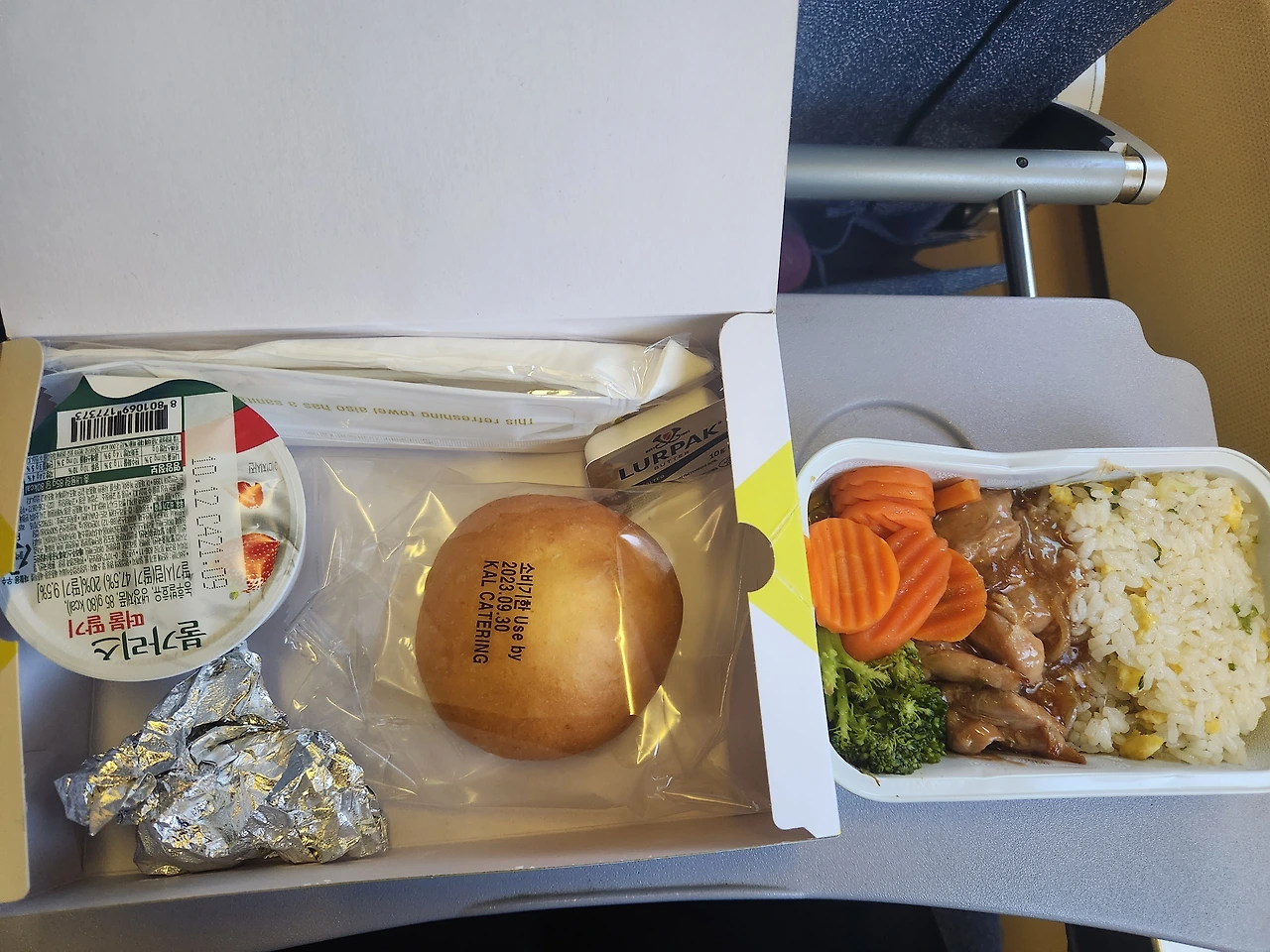 기내식은 내가 좋아하는 치킨라이스, 버터와 빵, 요구르트라 너무 잘 먹었다. 혹시나 와인이 있냐고 여쭤봤더니 카트에는 없는지 따로 가져다주셨다. 주문한 레드 와인은 아니었지만 오히려 화이트와인이라 홀짝거리기 더 맛있었다. 구름을 보면서 와인 먹는 시간 무엇....진짜 인생 참 행복해