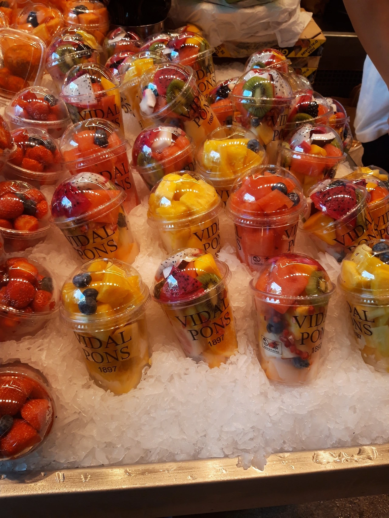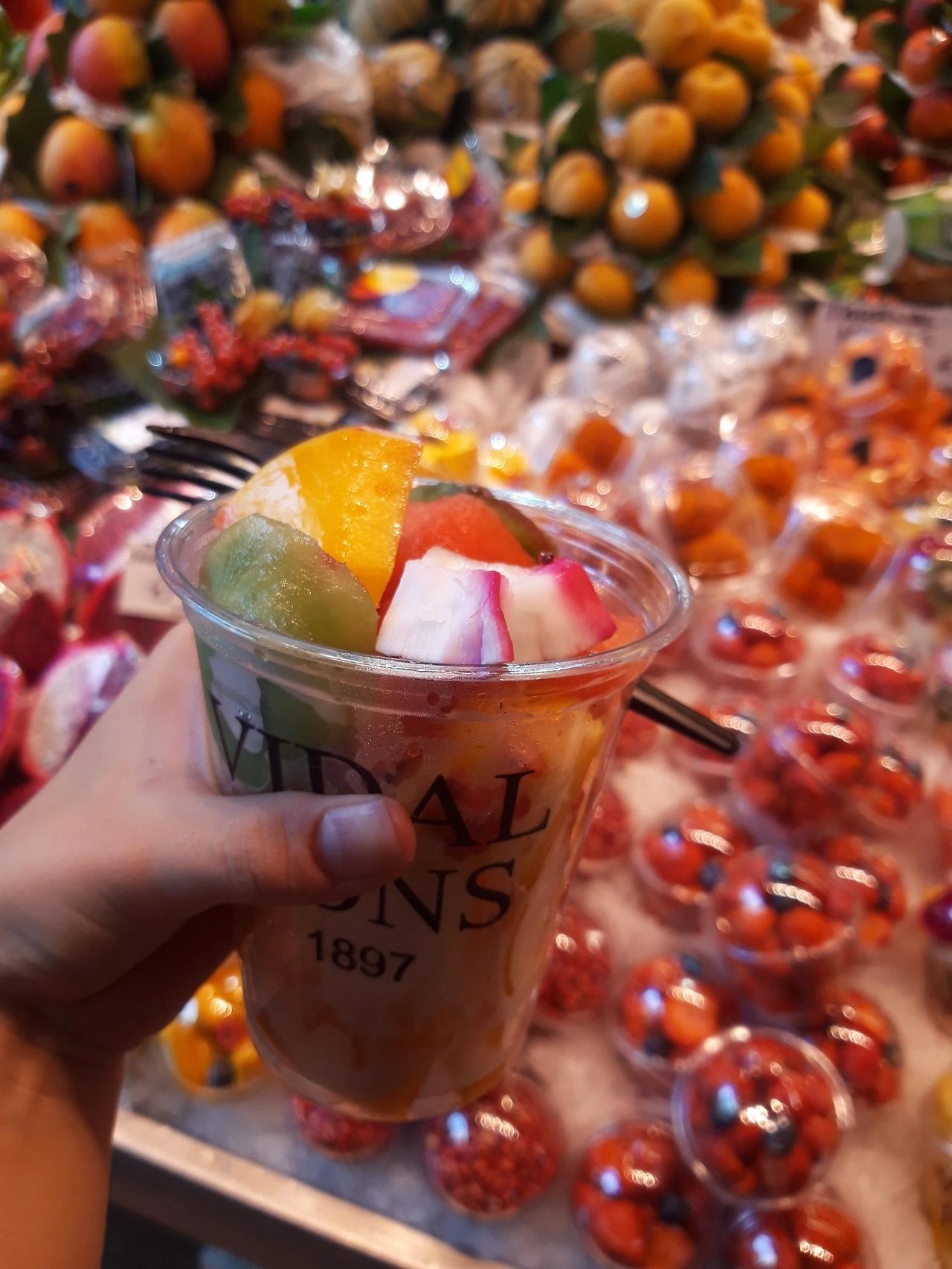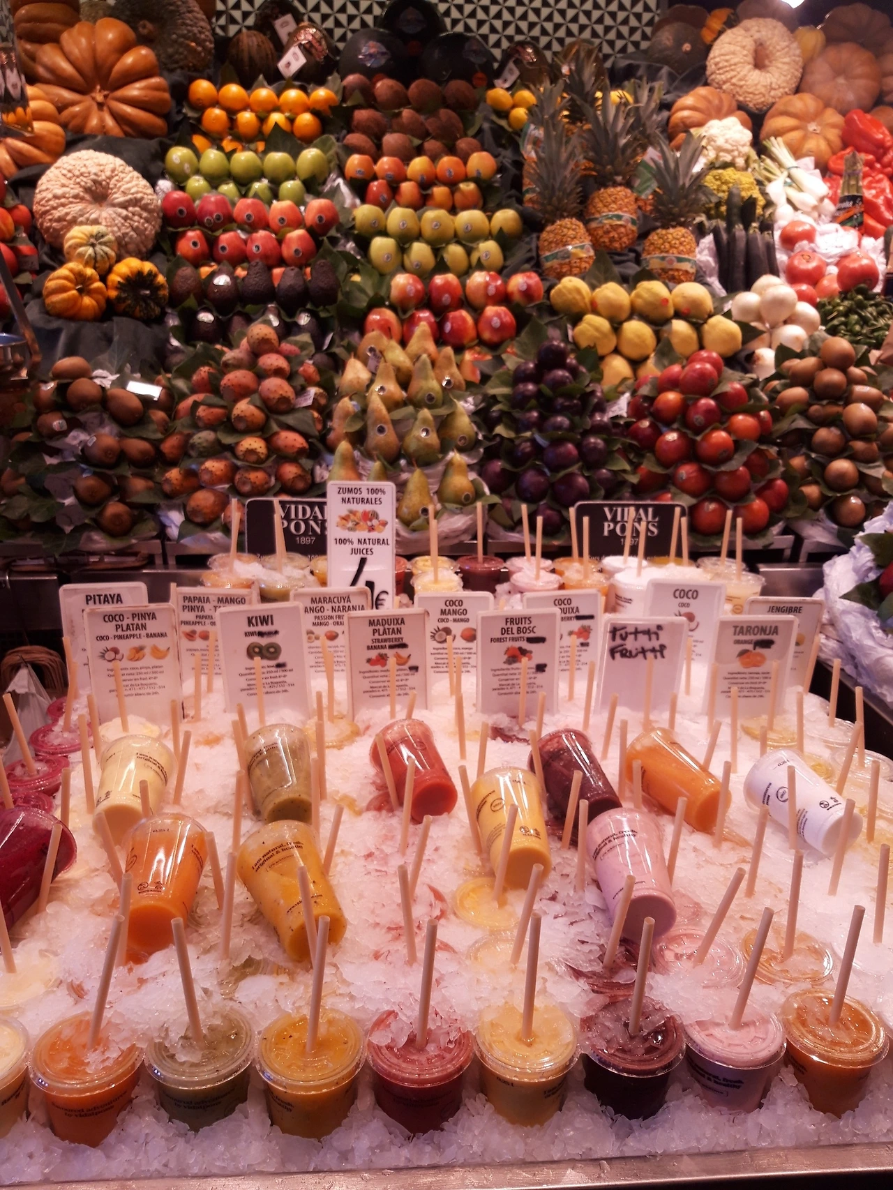 캐리어를 맡기고 길을 걸을 땐 배고프고 목도 말랐다. 보케리아 시장을 찾아가니 저렇게 착즙 한 주스들을 팔고 있어서 망고 파인애플 주스를 사서 원샷을 때렸다. 기본적으로 여기는 시장에서도 소액도 모두 카드를 사용할 수 있어서 좋았다.