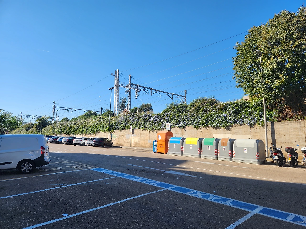 파란하늘과 초록 나무와 산책길. 그리고 담벼락 앞의 색깔별 쓰레기통과 그 위로 예쁜 라벤더빛 꽃나무.