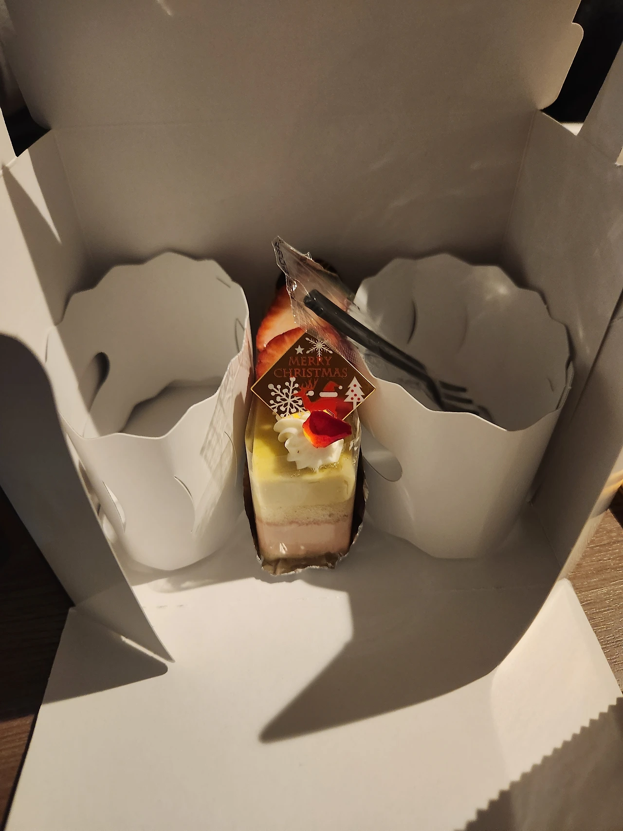 호텔에 돌아오는 길에 호텔 맞은편 카페에 들러 피스타치오 딸기 조각케이크로 하루를 마무리했다. 이날은 크리스마스 이브여서 축하의 의미로 산 디저트이다. 털게를 먹고 입가심을 위해 숙소에 와서 신라면에 한국에서 가져간 김치에 ufo컵라면에 삿포로 클래식까지 마셨다.