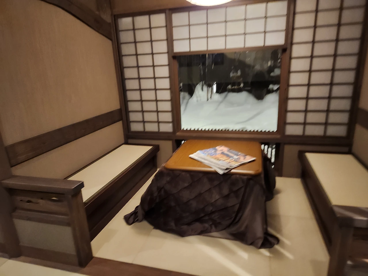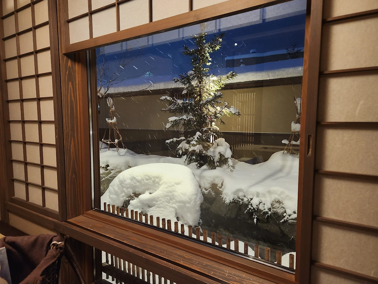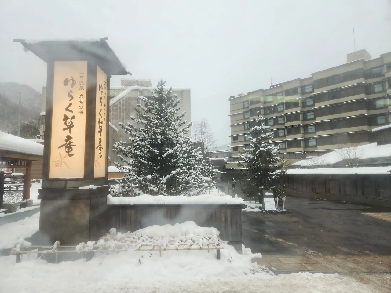 송영버스에서 딸기맛 모찌 아이스크림을 먹고나서 골아떨어진 채로 예약해놓은 료칸에 도착했다. 푹신한 패딩을 입고 하얀 눈길을 보고 있으니 잠이 스르륵 왔다.