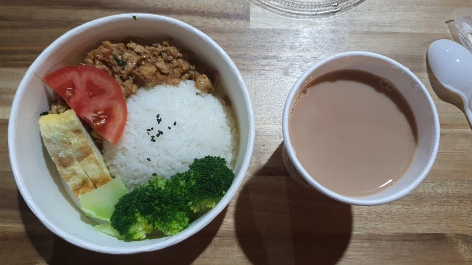 자가건강관리기간 동안 다른 투숙객과 마주칠까 호스텔 식당 구석에서 먹었던 포장음식