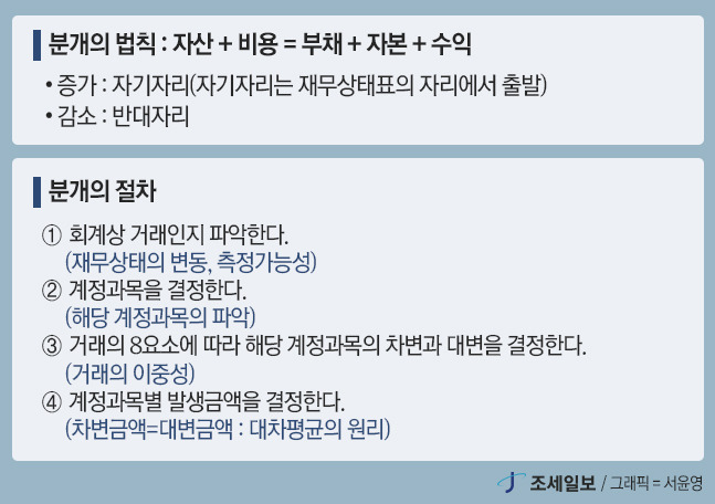 둘째, 분계의 원리를 알아야 한다. 거래가 발생하면 각 계정별 원장에 기입하기 전에 거래의 이중성 원리를 이용하여 기입할 계정과목과 금액을 차변과 대변으로 나누어 표시하는 것을 분개라고 한다.