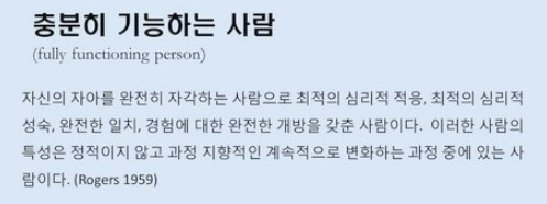 인간중심치료에서 주장하는 완전히 기능하는 사람은 5가지의 특징을 갖고 있다.
