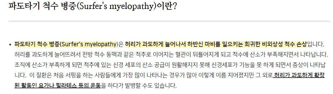 우연히 보게 된 교정전문 치과의사 선생님이 유튜브 게스트로 참여하게 되어서 자신의 경험담을 이야기하는 데 준비운동을 하지 않고 파도타기를 하다가 발끝에서 배부분까지 심한 통증이 오고 감각이 없어지기 시작하는 데 왜 그러지, 왜 그러지 하면서도 계속 파도타기를 계속하였다고 한다.