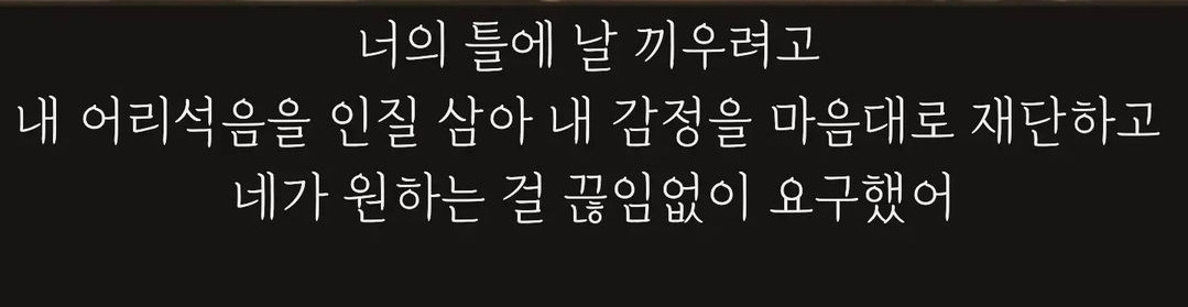 이윽고 당신이 양 발을 모두 내 안에 들이자 나는 본색을 드러내 당신의 팔다리를 자릅니다. 너그러이 사랑만을 고백하던 그는 온데간데 없고 오직 잔인하고 비겁한 악인만이 있을 뿐입니다. 그의 나약함이 사랑하는 이를 저급한 가짜 구원의 도구로 전락시켰습니다. 실로 구원은 그런 곳에 있지 않을텐데요.
