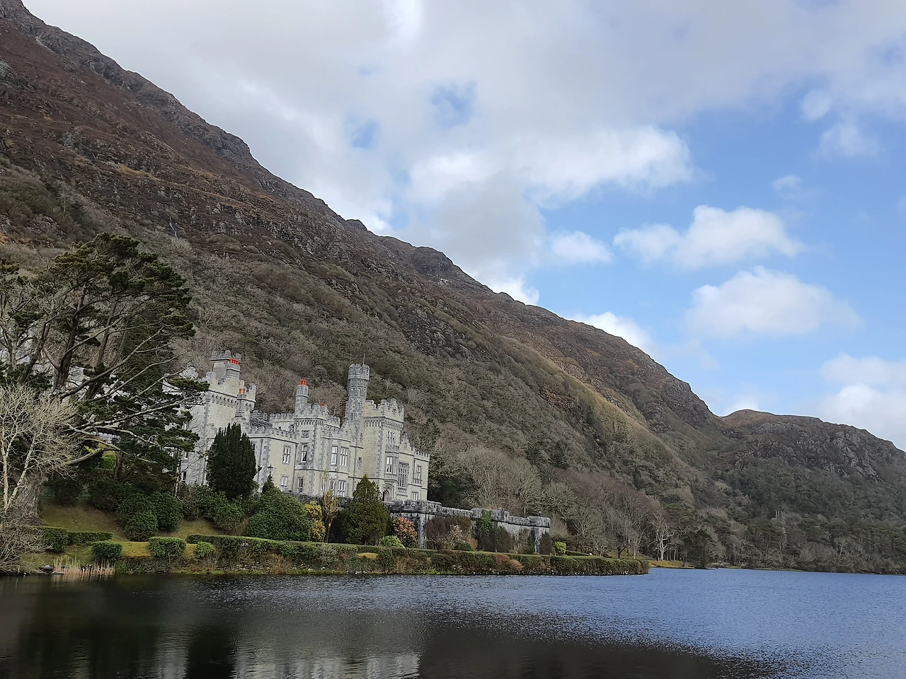 아침식사를 마치고 서둘러 숙소를 나와 아일랜드 북서부에 위치한 카일 모어 수도원을 구경하기 위해 끊임없이 펼쳐지는 목장 지대를 지나고 호수가 보이는 길을 따라서 두 시간을 넘게 운전하고 갔다. 그리고 아담해 보이는 호수 옆길을 따라서 가다가 사진에서 본 아름다운 회색의 성이 눈에 들어왔다. 그런데 보슬보슬 내리던 비가 장대비로 바뀌고 한 30분이 지나자 비가 잦아졌다. 얼른 안내소에서 입장료를 내고 성으로 향했다.