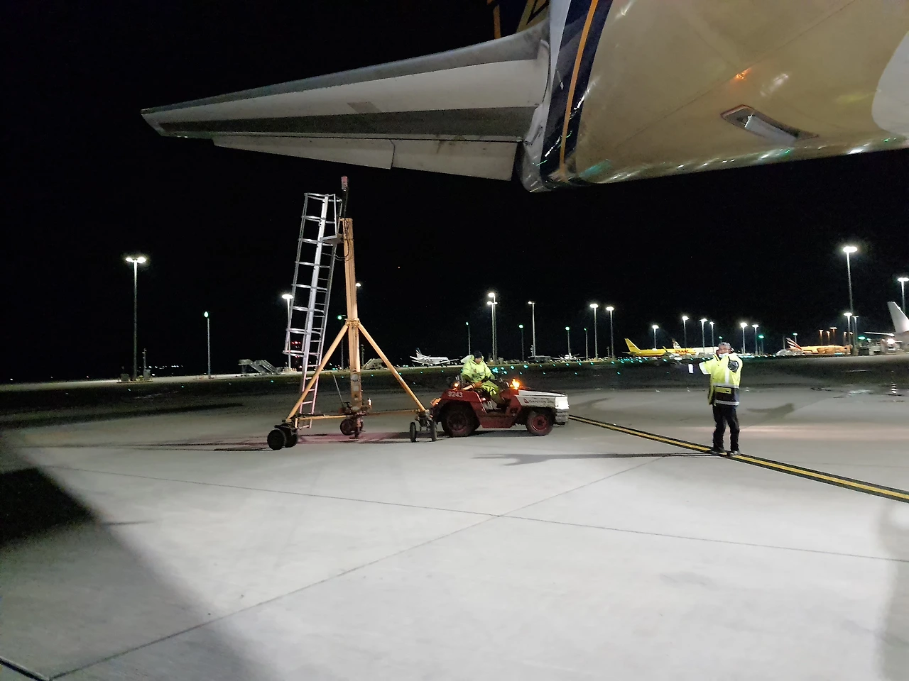 테일 잭을 핸들링하는 지상 조업 직원들을 살펴보며 계속적으로 관찰하고 마침내 안전하게 잭이 포인트에 고여졌다.