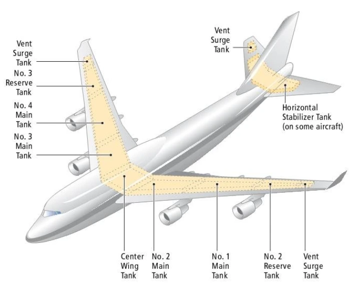 이런 육중한 항공기를 하늘에 띄우고 장시간 비행을 위해 필요한 연료를 싣을 수 있는 연료탱크가 있어야 한다. 항공기에 연료 탱크는 주로 날개 내부 공간, 꼬리날개와 동체의 중앙에 위치하고 있다. 연료 탱크는 단순히 연료를 저장하고 장시간 비행하며 무게 중심을 위해 전후방으로 연료를 이동시키는 공간으로도 사용되기도 한다.