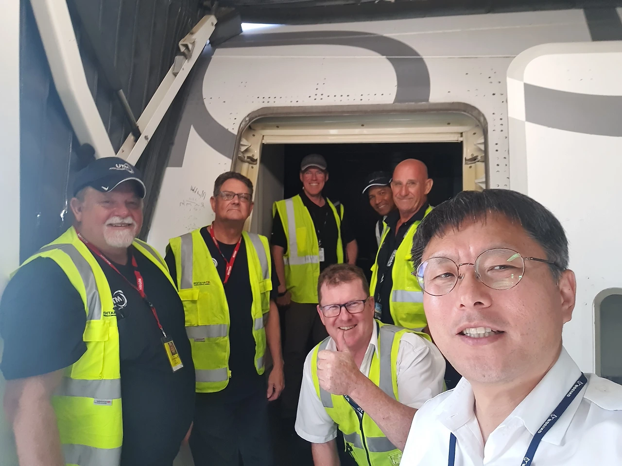 이제 마지막으로 비행하는 항공기의 객실 문 옆에 같이 고생한 동료들과 모두 사인을 하고 기념사진을 찍고 작별을 고했다.