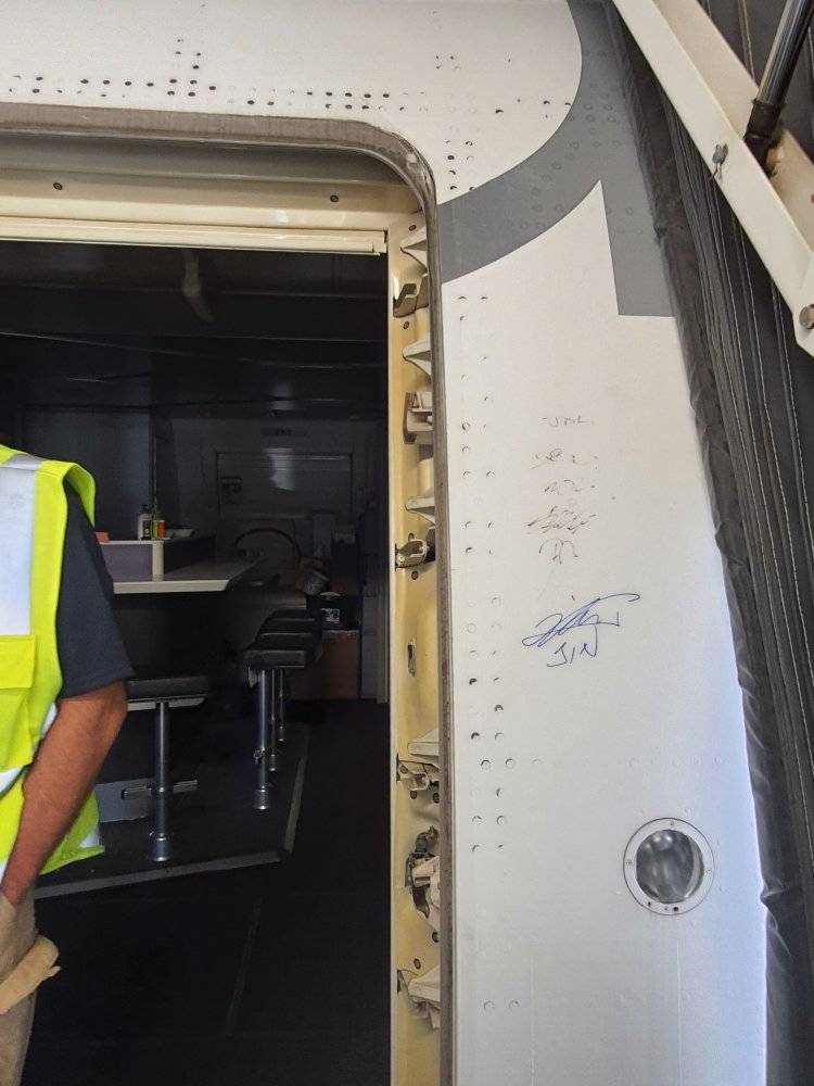 우리는 이 긴 여정을 함께한 항공기의 객실 문 옆에 서명을 남겼다.