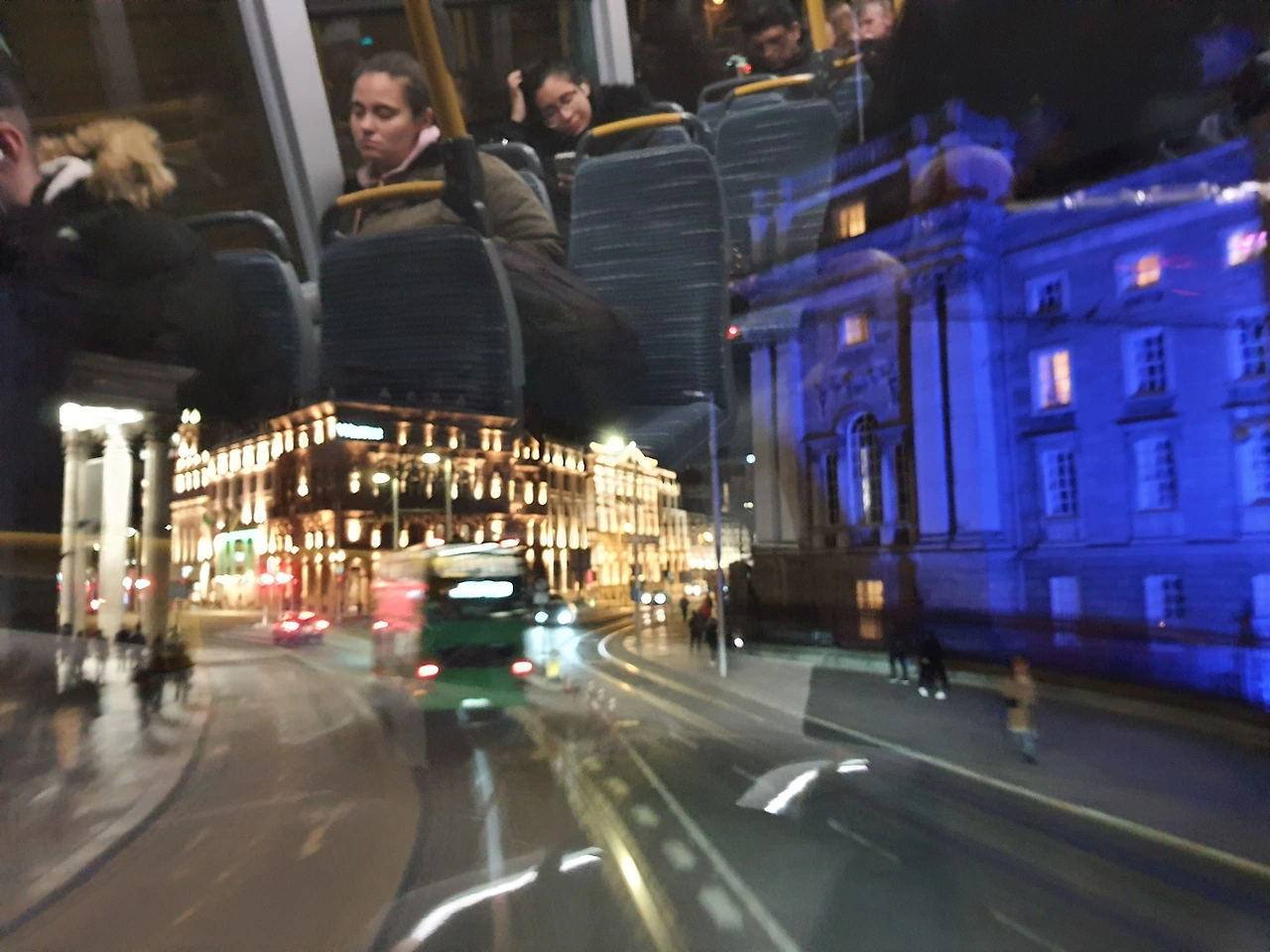 공항 터미널을 나와 버스를 타고 예약해 논 숙소로 갔다. 버스 노선 옆에 있는 건물들이 서로 붙어있는 오래된 전통 빌딩의 B&B 숙소였다. 체크인을 하고 버스를 타고 더블린 시내로 나갔다. 버스는 번화가인 오코넬 거리를 지나 오코넬 다리를 건너서 트리니티 컬리지 근처에서 내렸다.