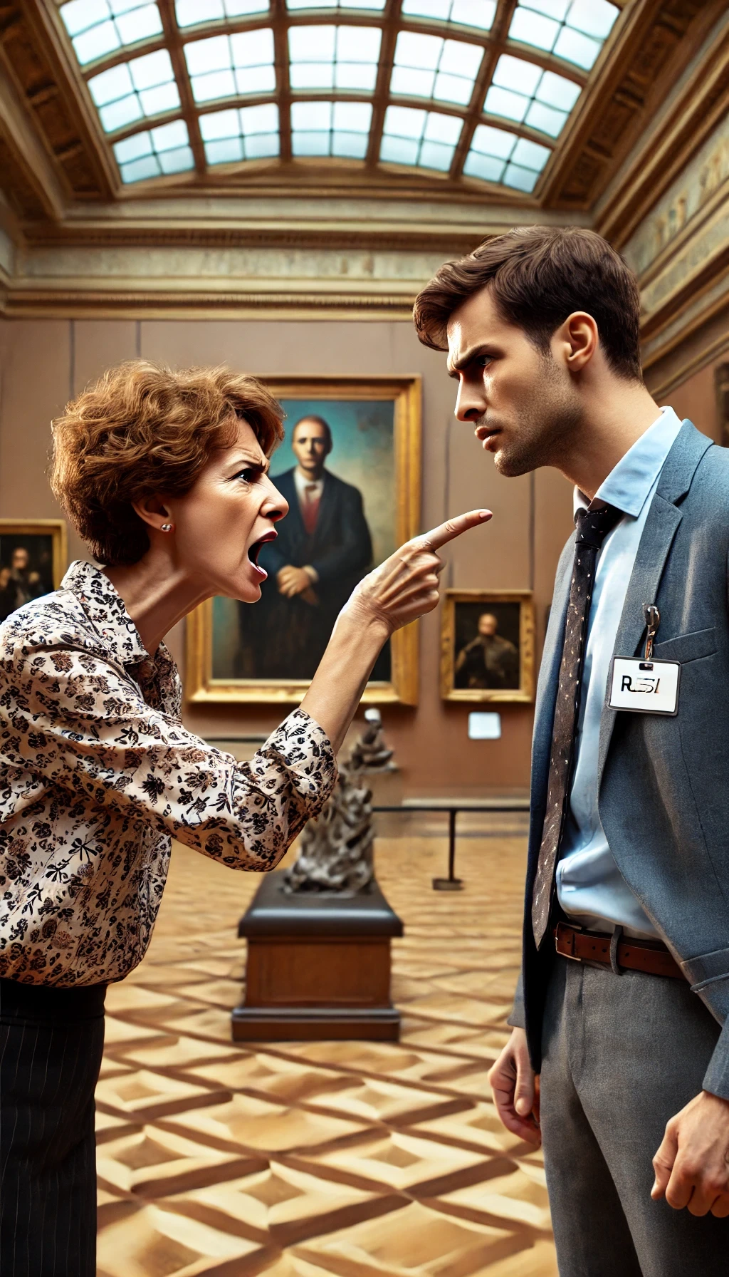 또 다른 어느 날, 화려한 인상을 가진 아주머니가 작품을 관람하고 있었다. 그 아주머니는 관람선 따위는 안중에 없이 작품을 보았다. 당연한 에티켓을 매번 주의를 줘야 한다는 사실에 입 아팠지만 말해야 했다. 내 주위에 있는 한 스태프가 작품이 진품이니 조금만 주의하여 관람선 밖에서 관람하라고 했다. 앞서 몇 번 그런 지적을 당했는지 분노를 끓여 올려 스태프에게 뭔데 난리냐며 소리를 질러댔다.