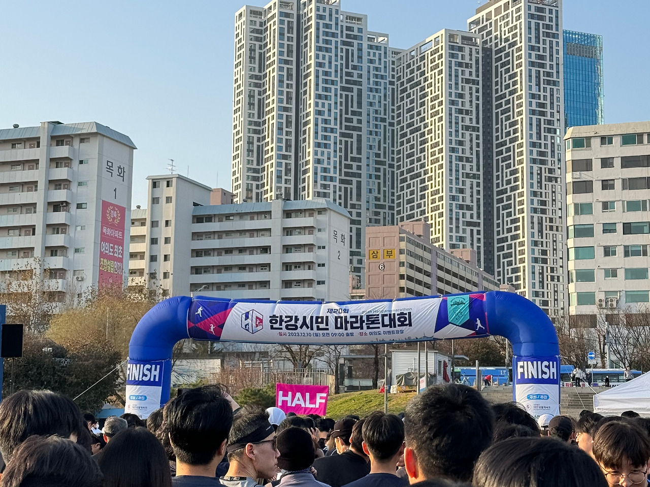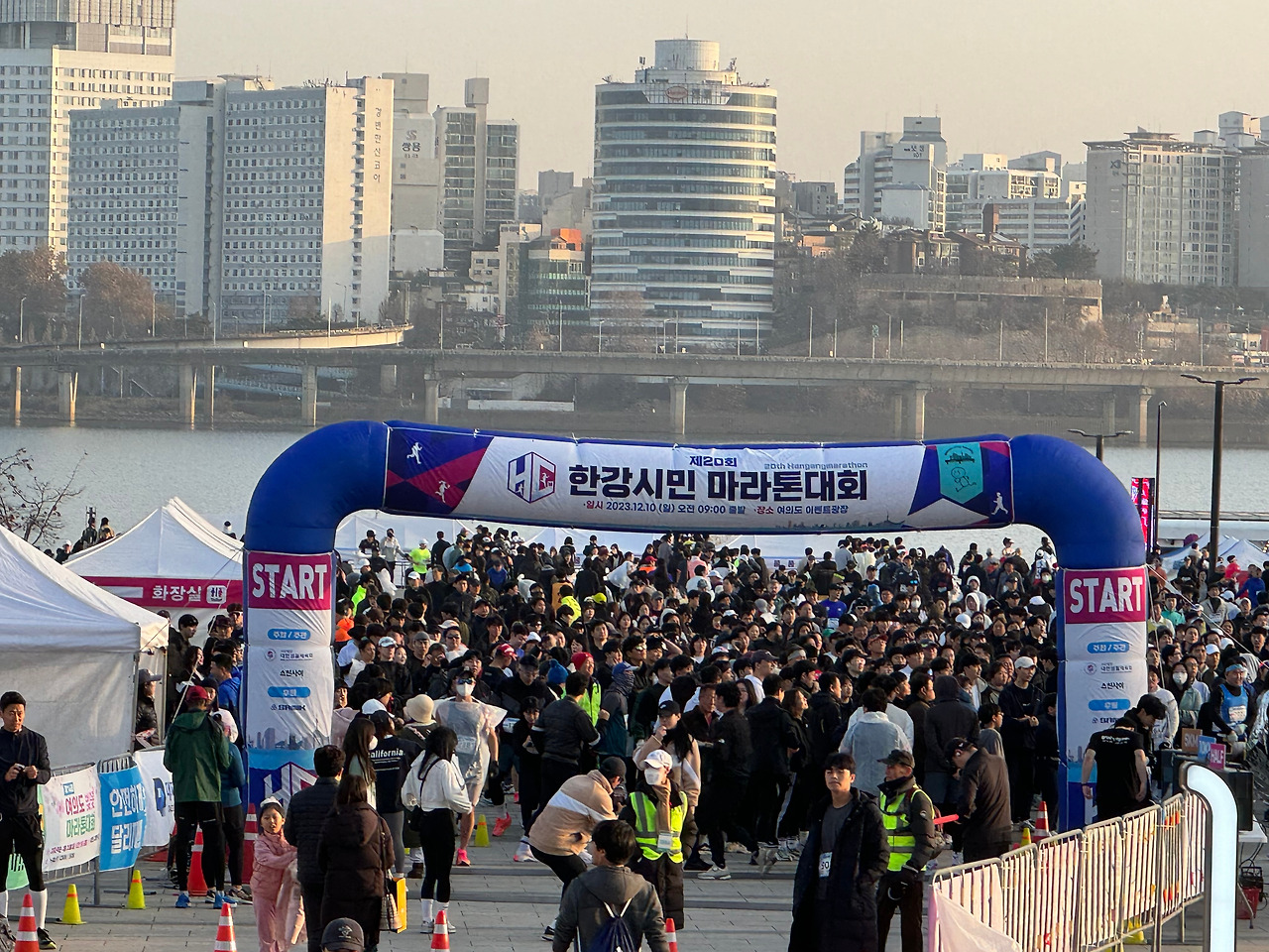 12월 10일, 한강시민마라톤대회. 새벽같이 출발하여 도착한 여의도역은 사당역과는 사뭇 다른 분위기였다. 주말 아침 사당역은 알록달록한 등산객들이 있었다면, 마라톤 대회가 열리는 이곳에는 검은색과 흰색으로 무장한 사람들이 대부분이었다. 검은색 옷에 배번호판을 달고 있는 사람들을 따라 바깥으로 나오니 자연스럽게 대회장에 도착하게 되었다.