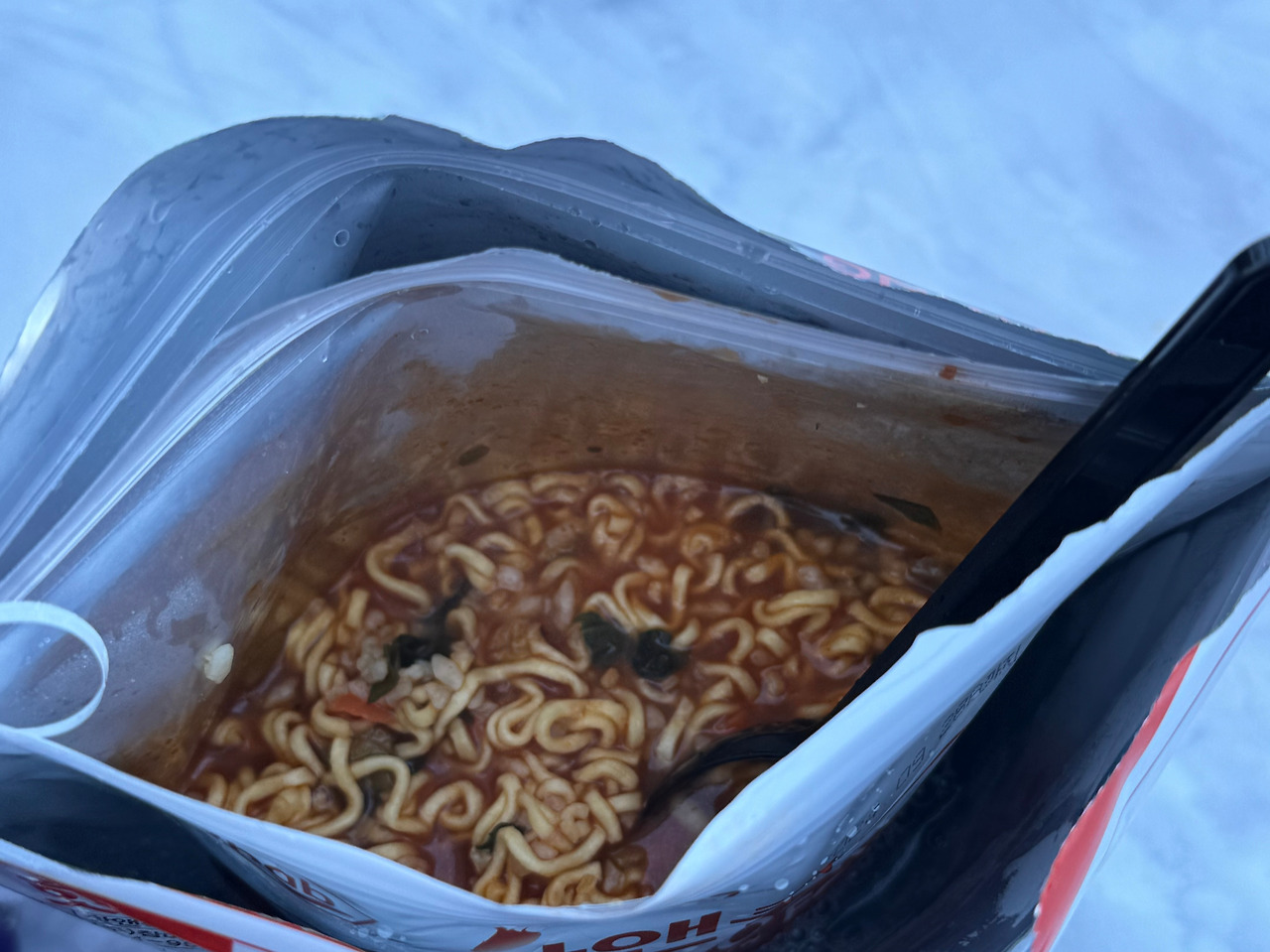 결국 나도 정상을 보고 빠르게 하산했다. 나무가 바람을 막아주는 곳에 들어가야 살 것만 같았다. 오늘의 산행 푸드는 발열라면이었지만, 이 추위에 어떻게 먹어야 할지 걱정이 앞섰다. 겨울 산은 처음이라 몰랐는데, 등산을 자주 다니는 분들은 투명 비닐로 만든 쉘터 안에서 따뜻하게 식사를 하고 계셨다.