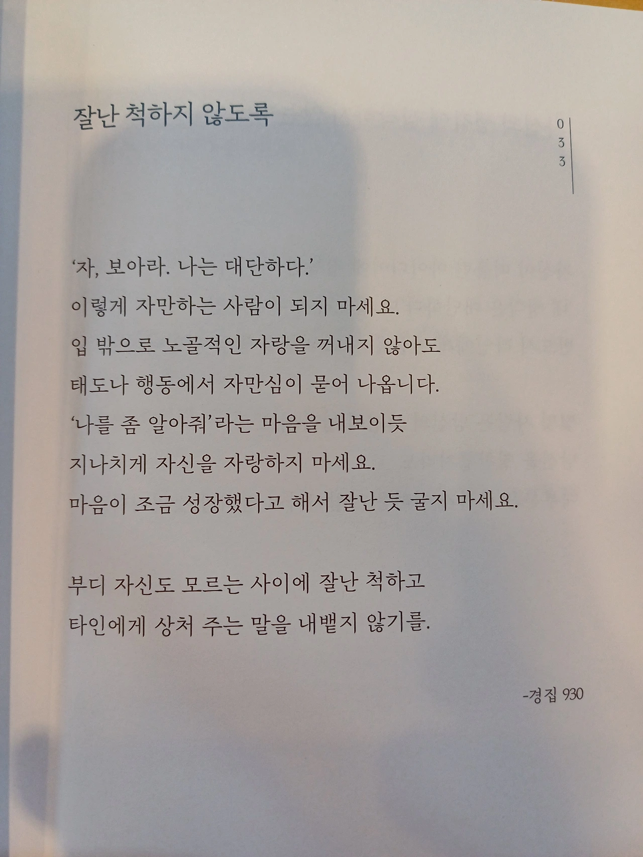 내가 독서나 공부할 때에 그것들을 남들에게 말하지 않는 이유는 대화가 아니라 지나치게 잘난 척해서 타인의 감정을 다치게 하지 말라는 불경 관련 도서의 글귀 때문이다.