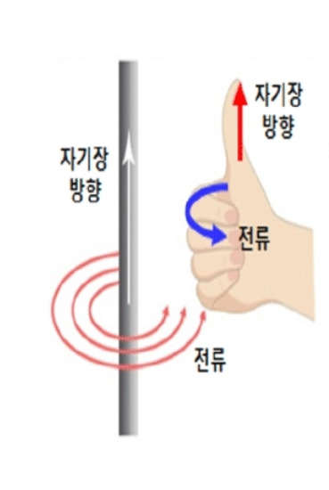 예를 들어서 위의 그림을 보면 오른쪽 엄지 손가락이 상단을 향하고 나머지 네 손가락을 접고 있을 때에 엄지 손가락은 자기장의 방향이고 나머지 네 개의 손가락은 전류의 방향을 나타낸다.