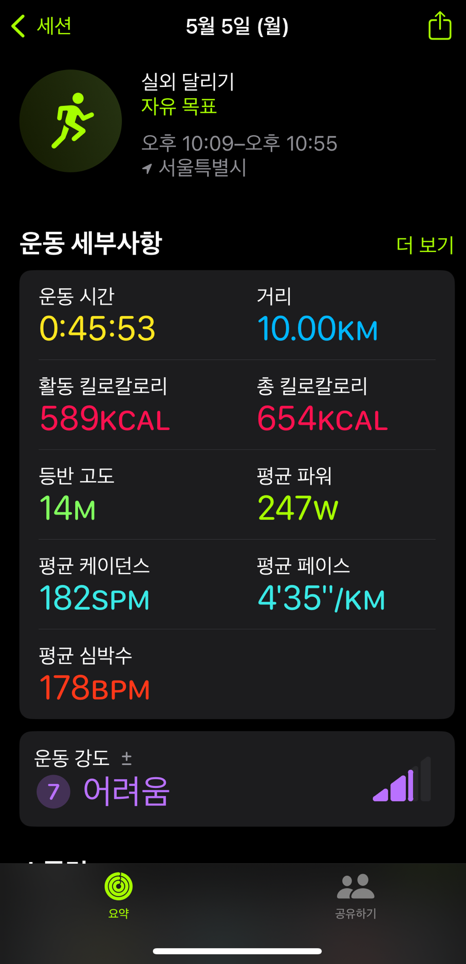 러닝 도중에도 몸이 한계라거나, 심장이 터질 듯 뛰거나, 숨이 턱까지 차는 일은 없었다. 다만 평소보다 다리에 힘이 더 많이 들어가면서 후반부에 피로가 조금씩 쌓였다. 그럼에도 내가 집에서 예상한 것만큼 지치지 않았다. 아니, 오히려 나는 준비가 되어 있었던 것이다.