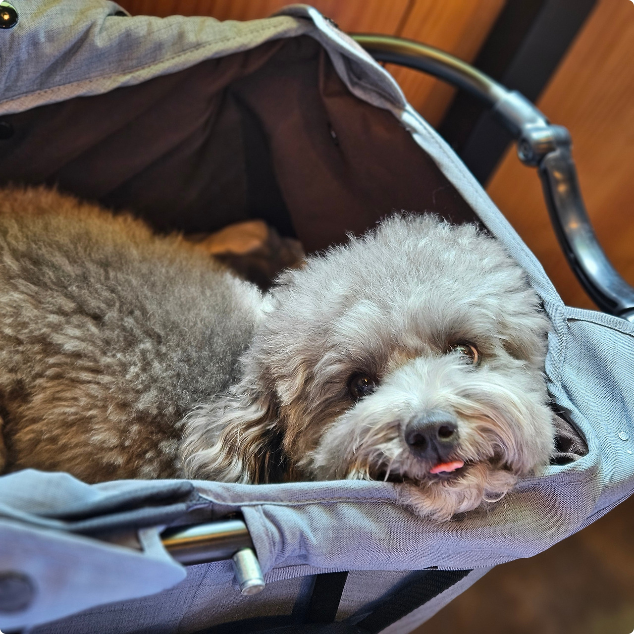 도착하자마자, 유모차를 꺼내어 개를 앉혔다.