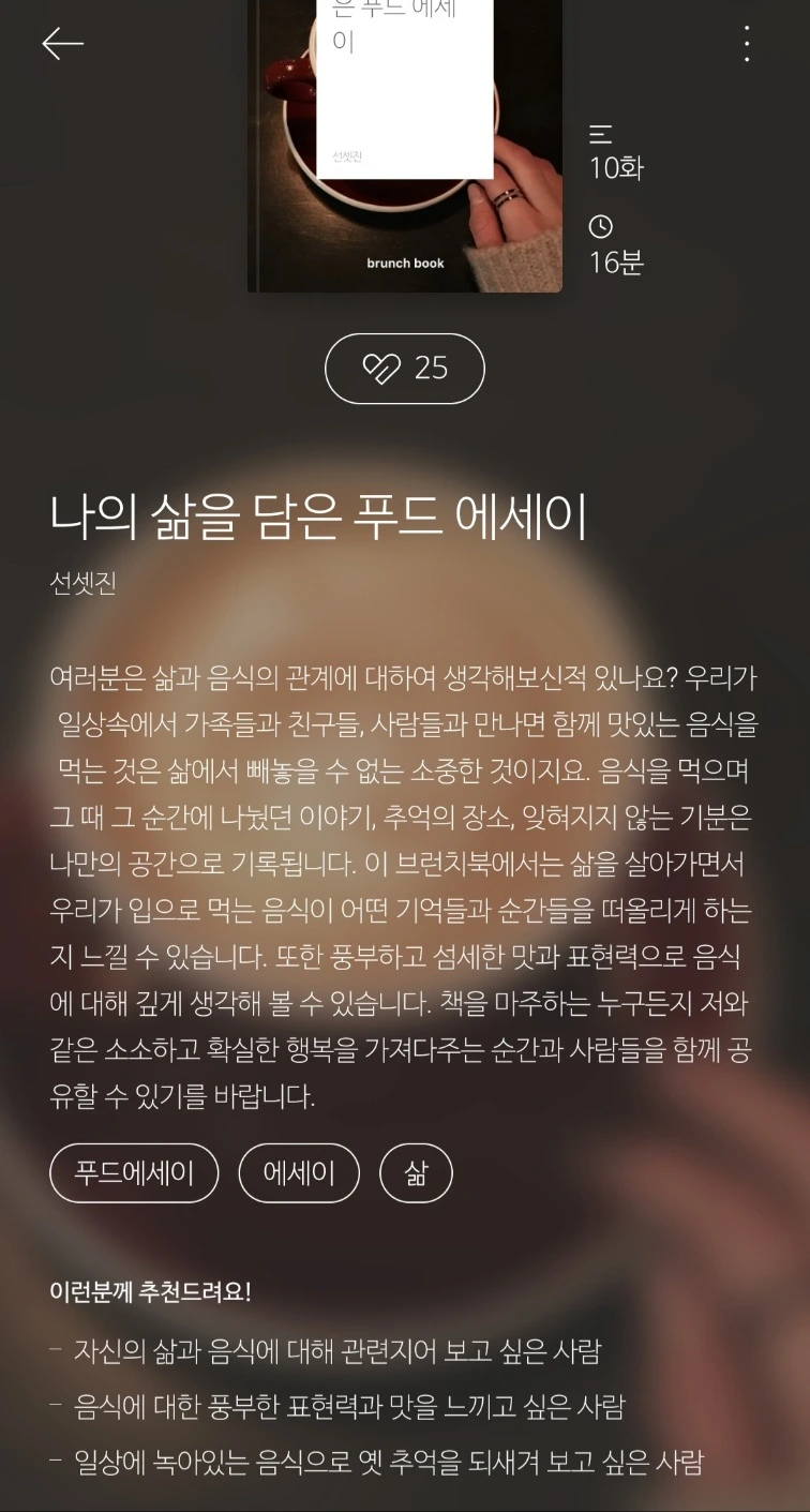 나를 음식으로 표현한다면, 비오는 날 생각나는 음식, 내 부모님의 맛 등으로 주제를 잡고 브런치 북에 대한 소개 글을 상세하게 적고 추천 이유도 작성했다.