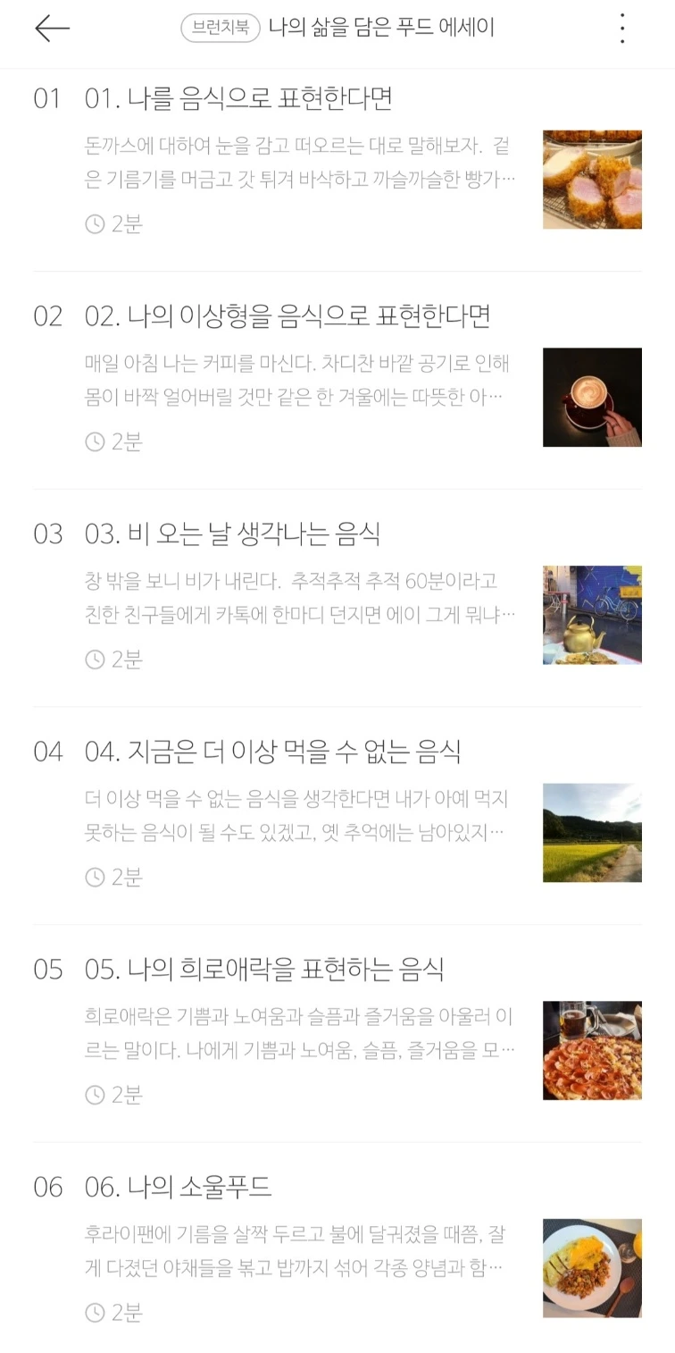 '나의 삶을 담은 푸드 에세이'라는 브런치 북을 만들어 10개의 주제로 구성된 글에 내가 직접 찍었던 사진을 추가하고 순서를 적절히 조합하여 엮었다.