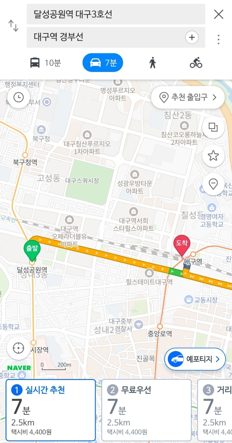 그때 달성공원역-대구역까지가 가상으로 택시를 탔을 시 7분이라는 최단 시간이 나왔다.