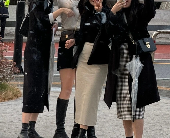 목이버섯은 블랙 트렌치코트에 블랙과 화이트가 잘 매치되어 있는 체크무늬 스커트.