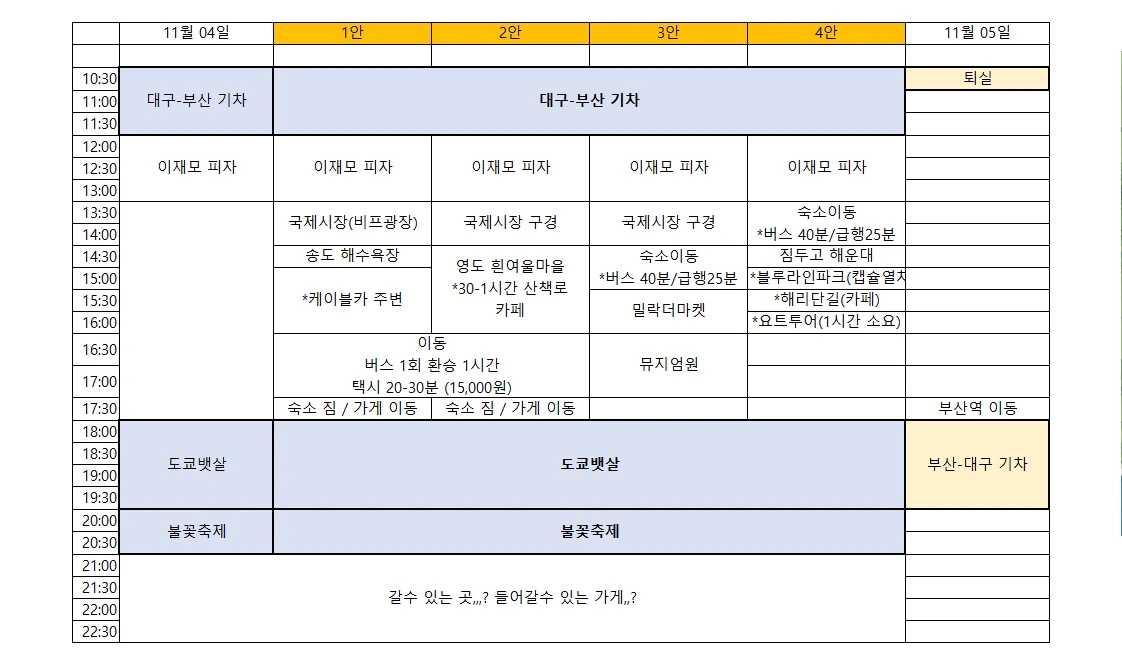 그리고 계획표는 구체적으로 짜보려고 노력은 했으나 결국 부산에 가서 맛집과 다음날 일정도 그날 정했다.(나름 불안하면서도 꽤나 안정적인 여행이었다 ^^)
