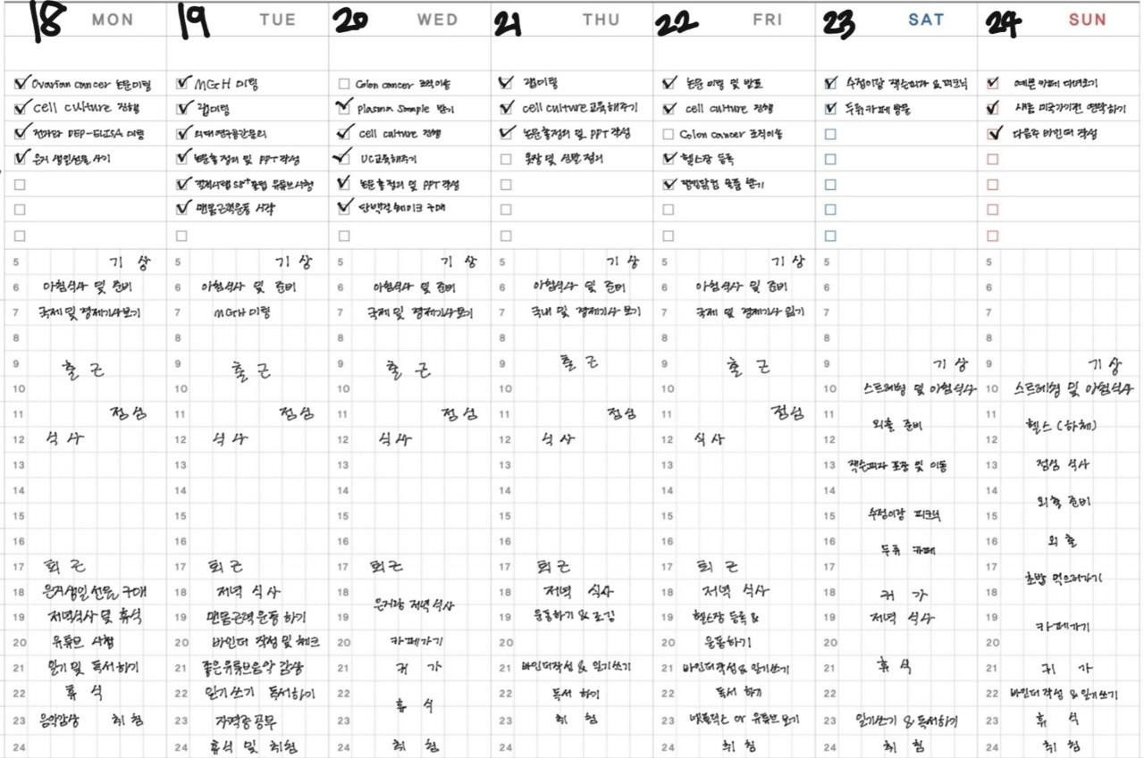 전 주 일요일에 월~수 일정을 구체적으로 작성해두고 수요일에 다시 목~일 일정을 작성해둔다.